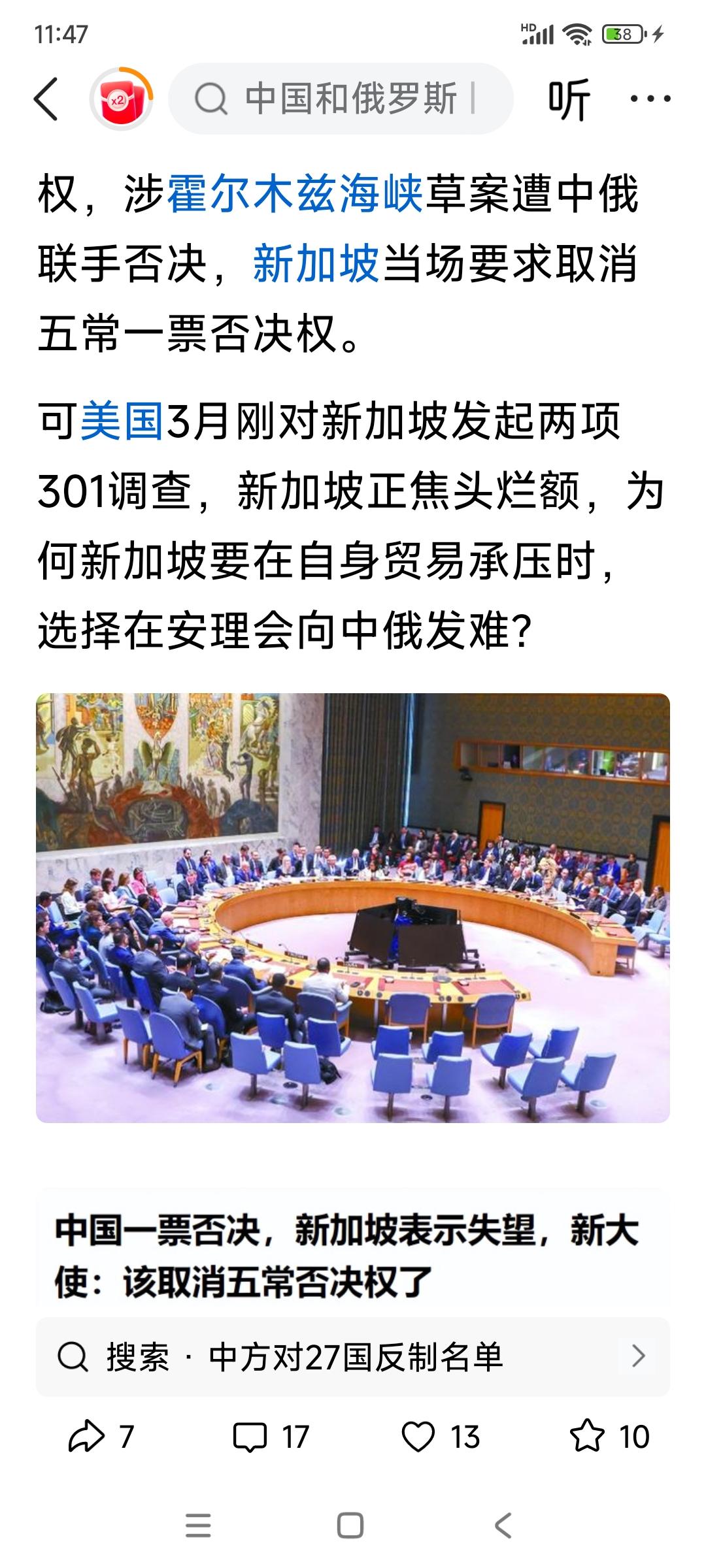 就因为中俄联手否决涉霍尔木兹海峡草案,新加坡竟然当场要求取消五常的一票否决权。