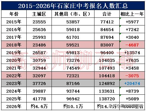 梳理近十年石家庄中考报名数据,增长轨迹清晰可见,1、从2015年到2026年,11年间考生人数近乎翻倍,其中仅在2018和2022年考生人数出现过下滑,其余年份均呈增长态势。人数增量最大的年份是2023年,比上一年增长两万余人。2、郊县考生始终是增长主力——2026年郊县及新三区考生约10.1万人,主城区(长安、桥西、新华、裕华、高新)考生约4.6万人,主城区人数首次突破4万,供需矛盾进一步加剧。