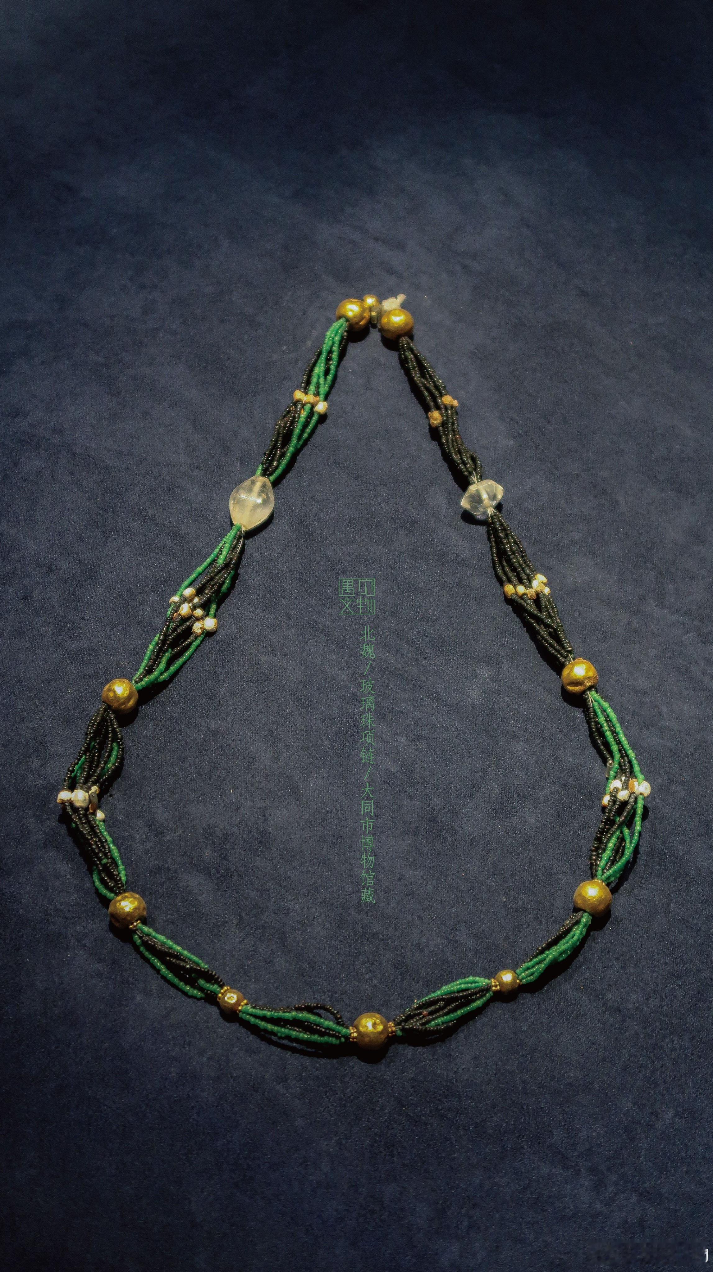 由4800余颗粟米大小的黑绿色扁圆形玻璃珠所串,珠子孔细如发丝工艺极致奢华,代表了当时北魏贵族的配饰与文化审美,与冯太后基本属于一个历史阶段