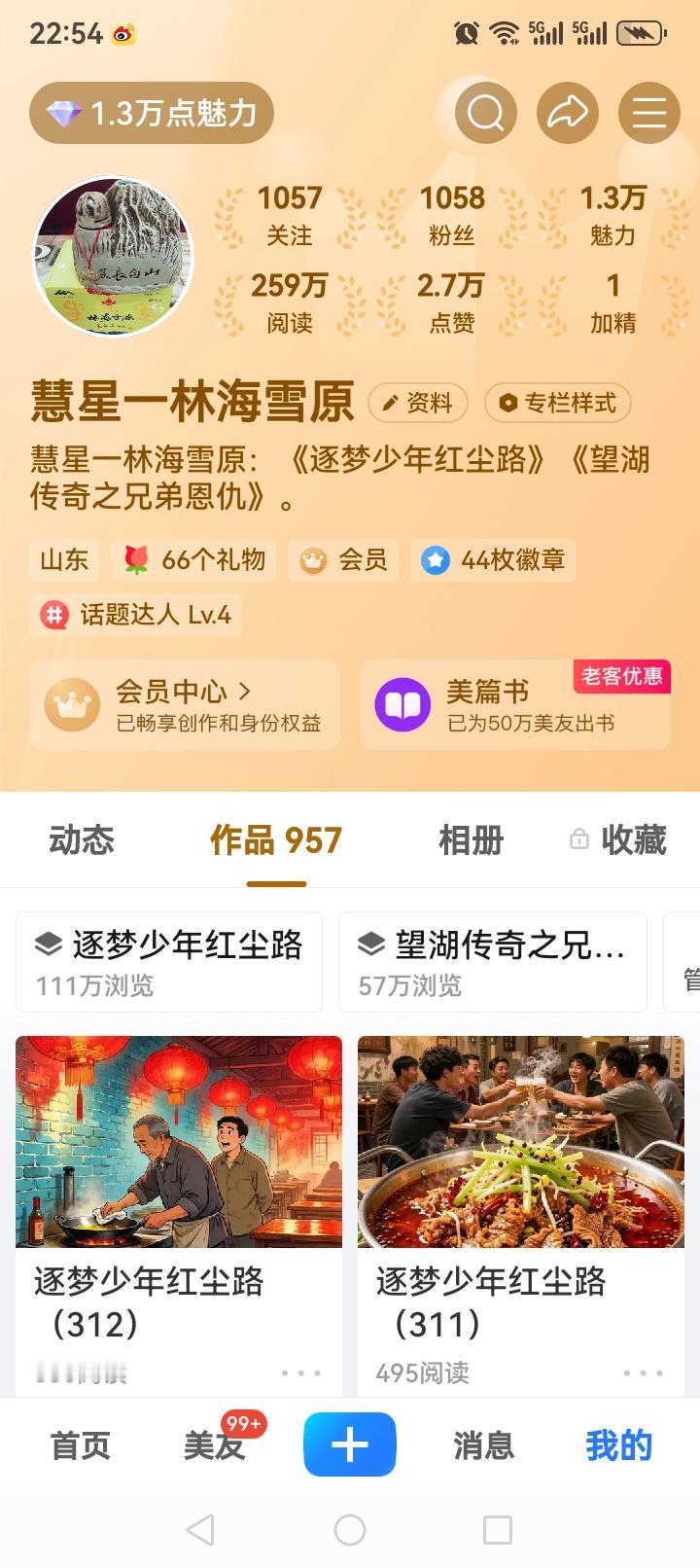 我是慧星一林海雪原,《逐梦少年红尘路》作者。本作品仅美篇单平台阅读量突破111万,被微博智搜认证为“民间档案”,以九十年代改革浪潮下的草根群像,引发百万读者共鸣。