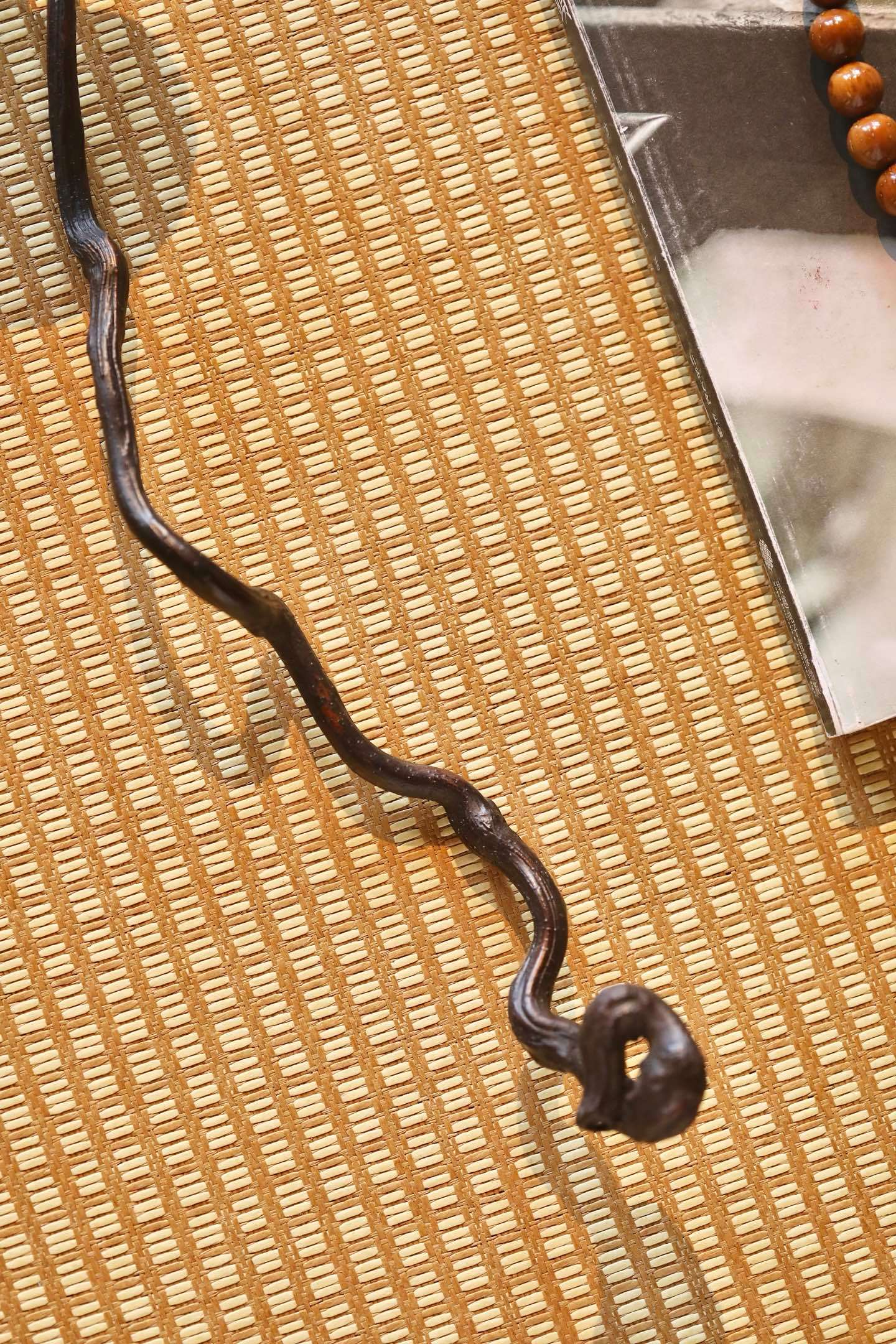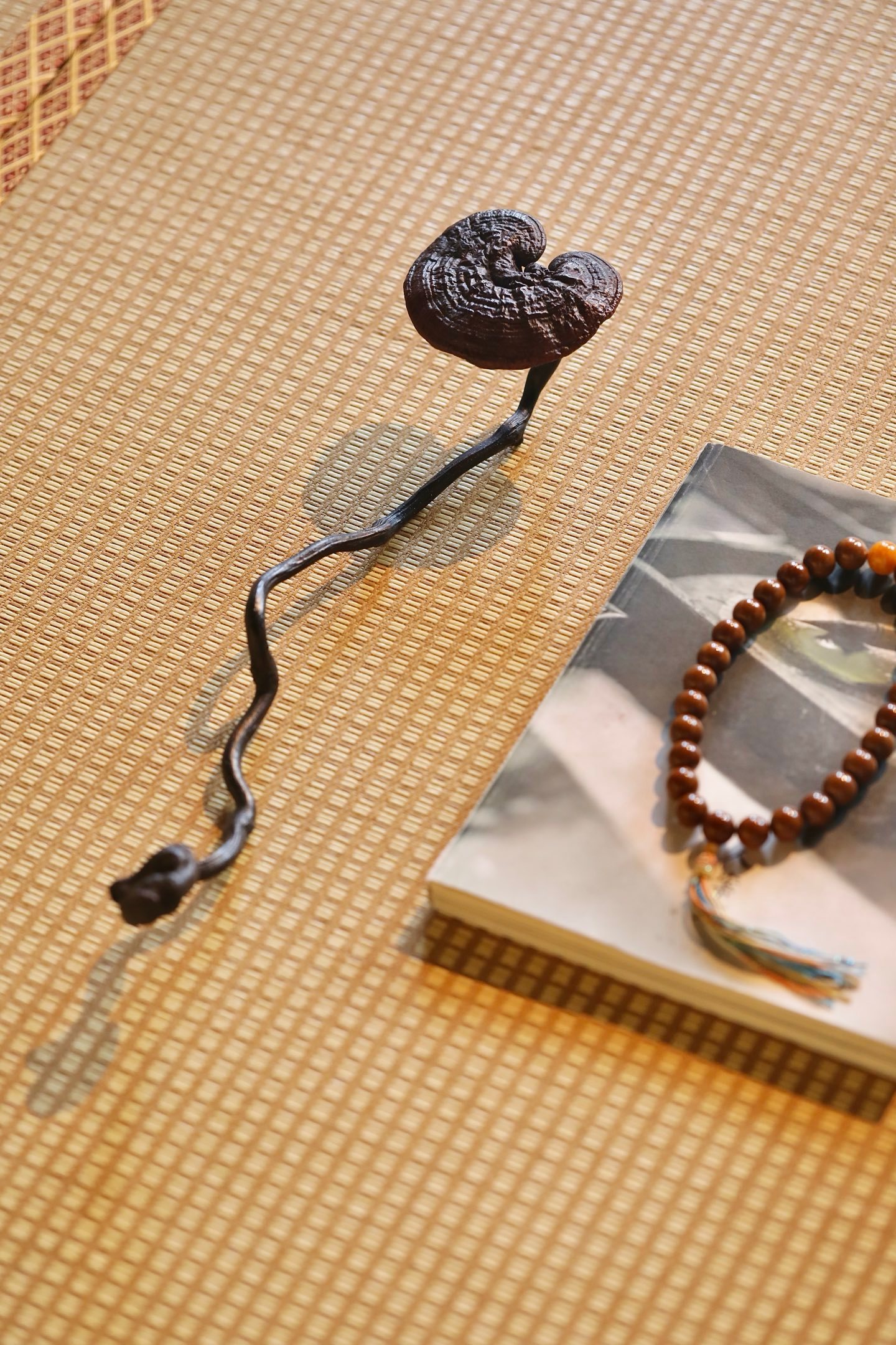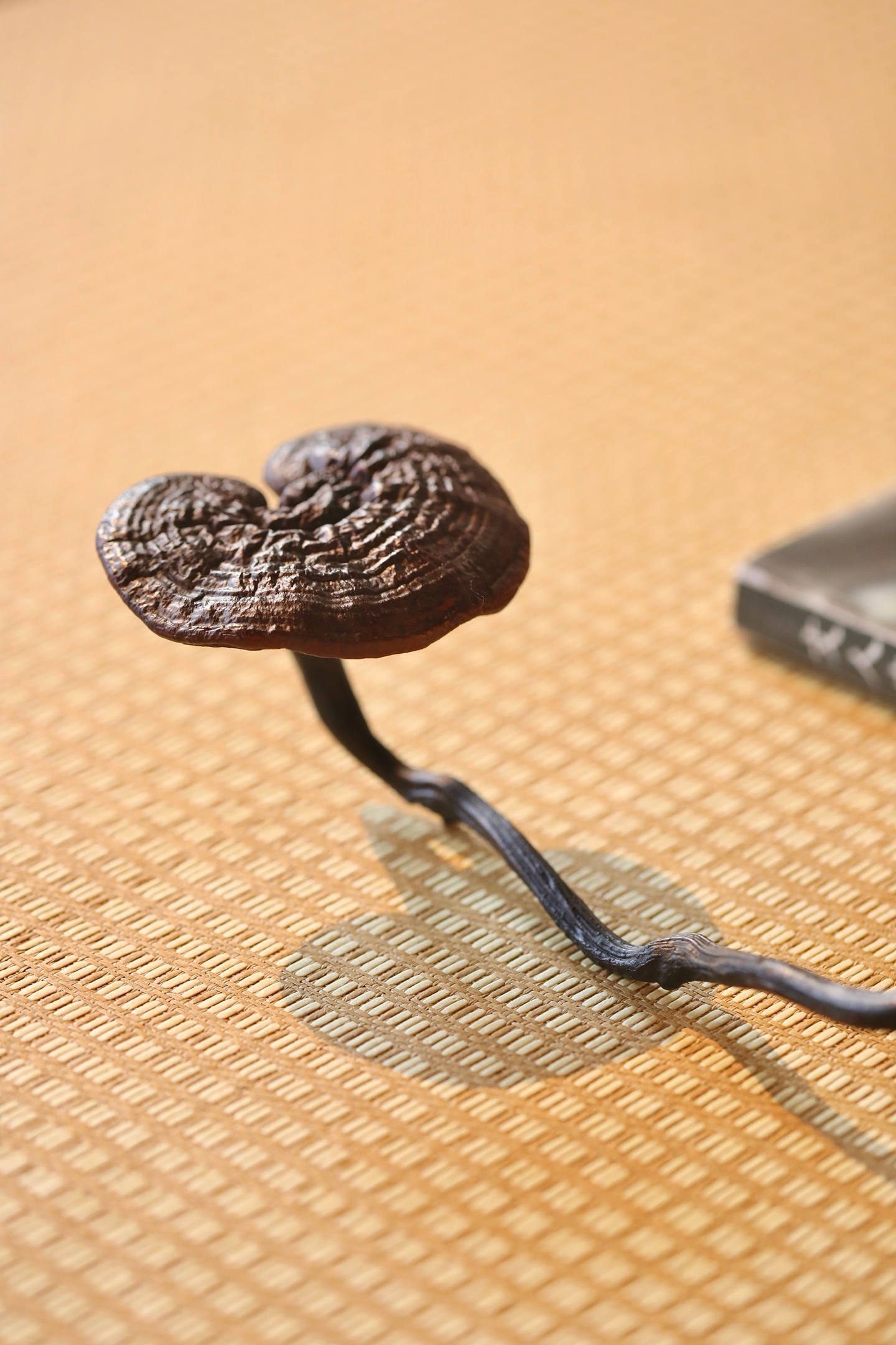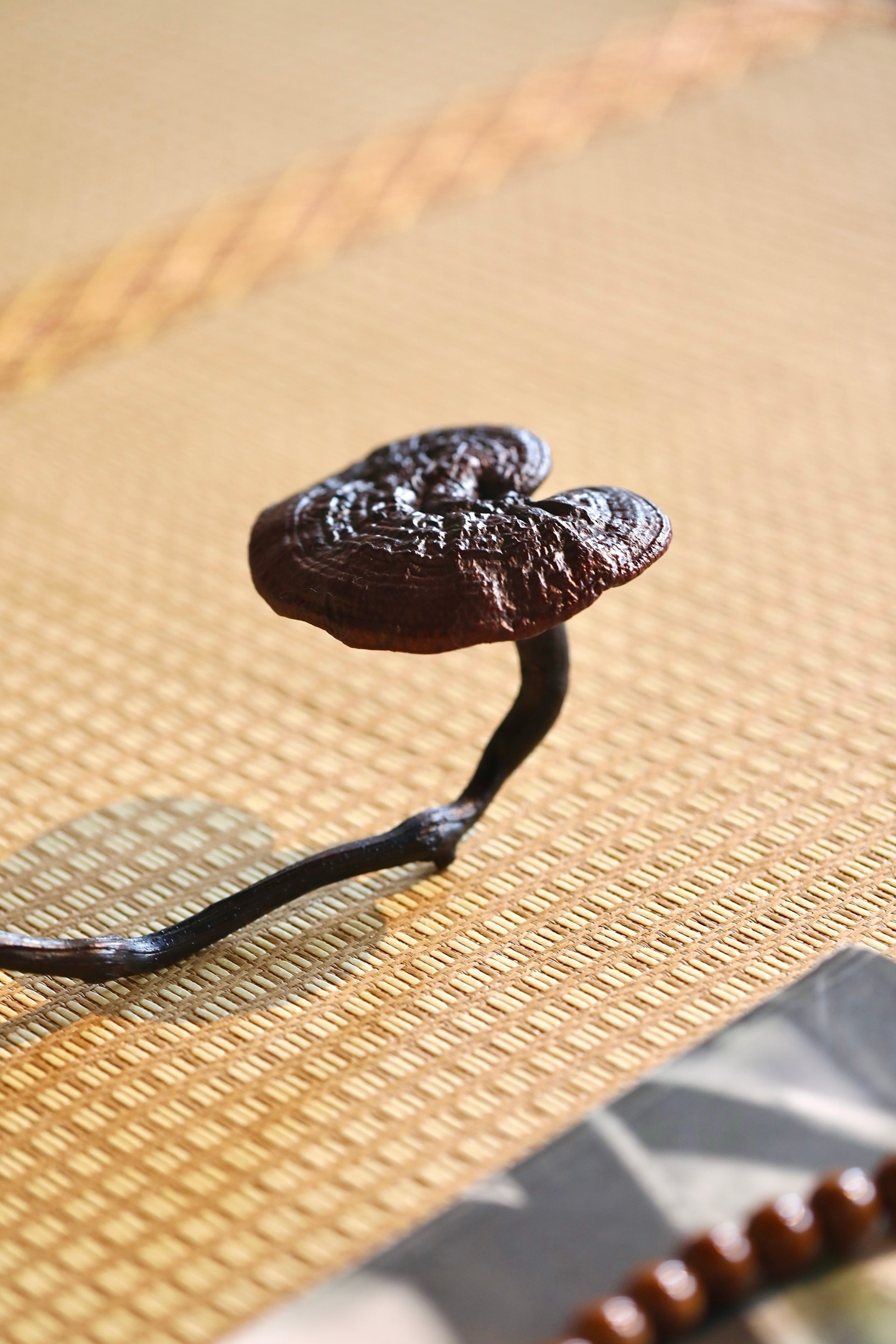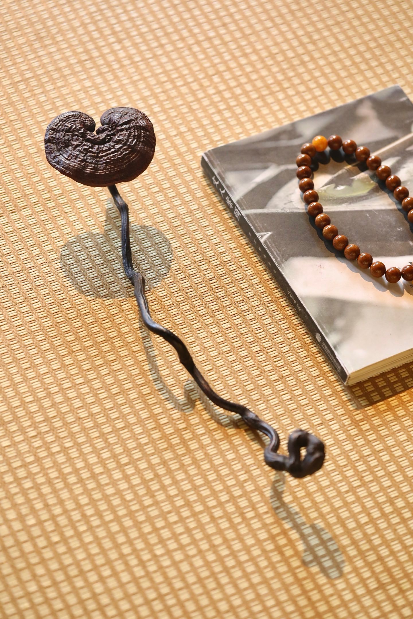 以天然灵芝与奇木枝茎相合而成,取灵芝为首,虬枝为柄,通体不施矫饰,尽展天然意趣。灵芝菌盖呈天然心形,色如深绛凝脂,表面环纹层叠如古木年轮,肌理褶皱苍然,自带“千年灵物”的沉穆气韵;菌柄虬曲如游龙,天然木纹盘绕,色泽沉黑如漆,包浆温润,与灵芝浑然一体,线条婉转流畅,如流云拂袖,尽显“天工开物”的自然之美。
