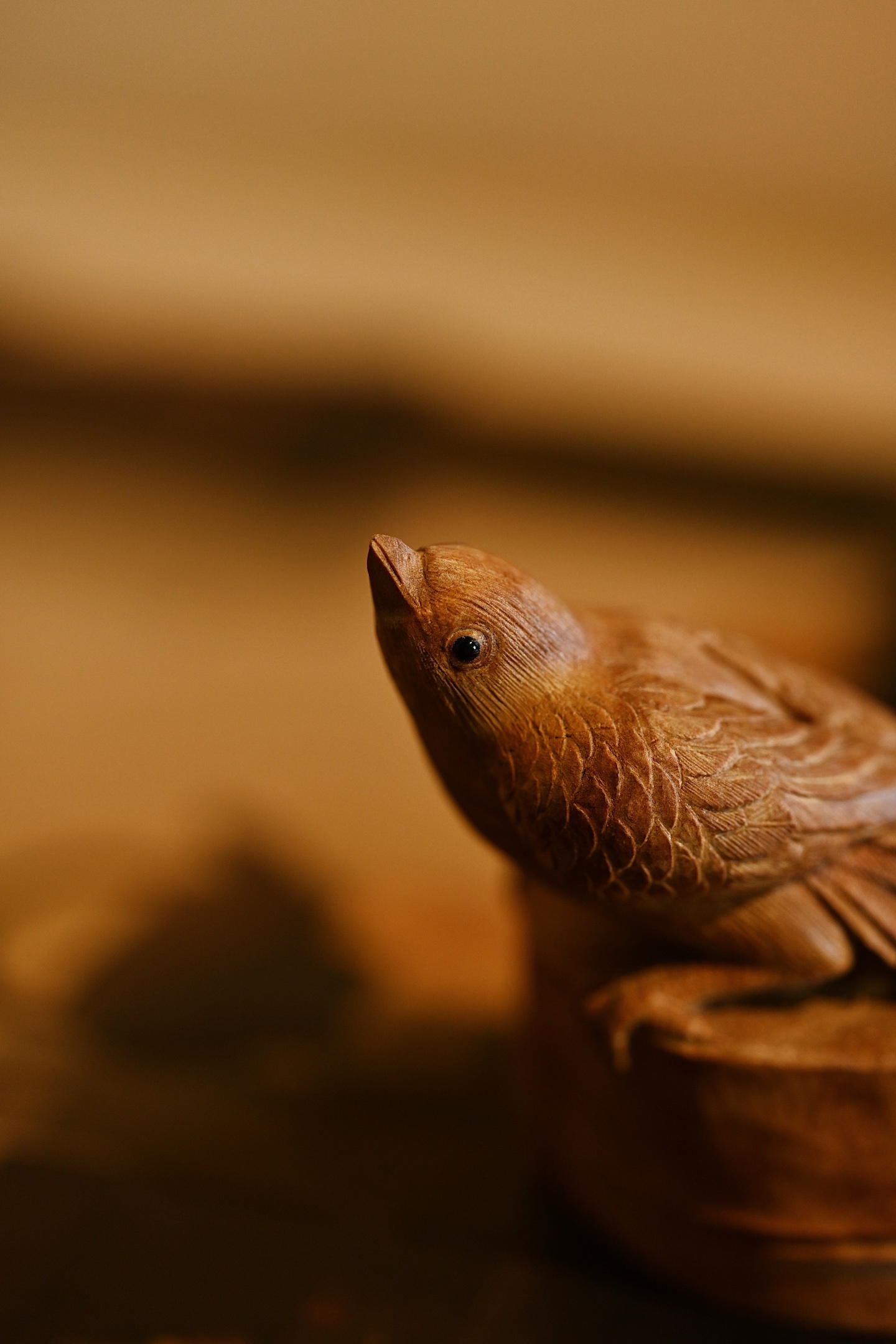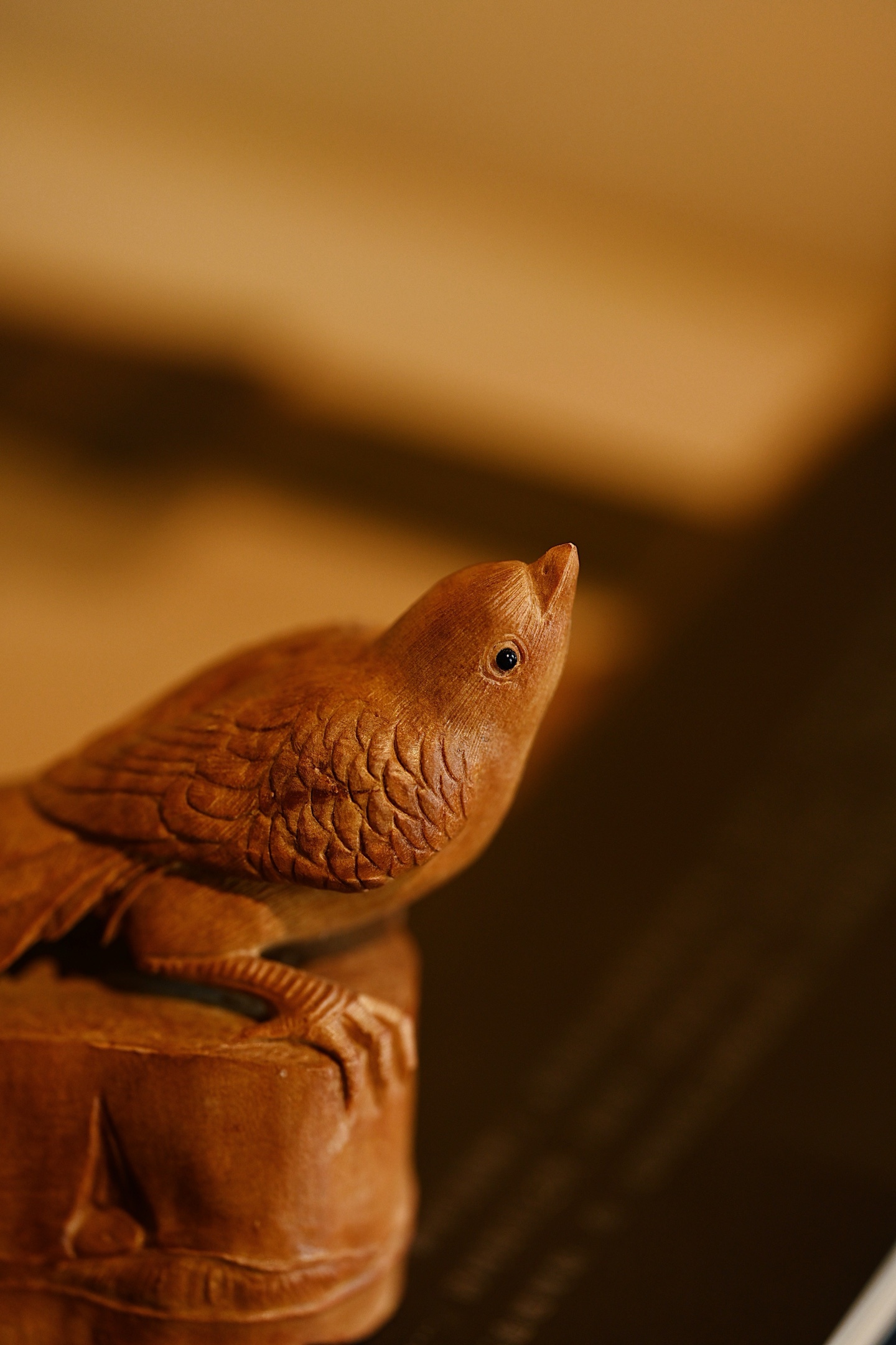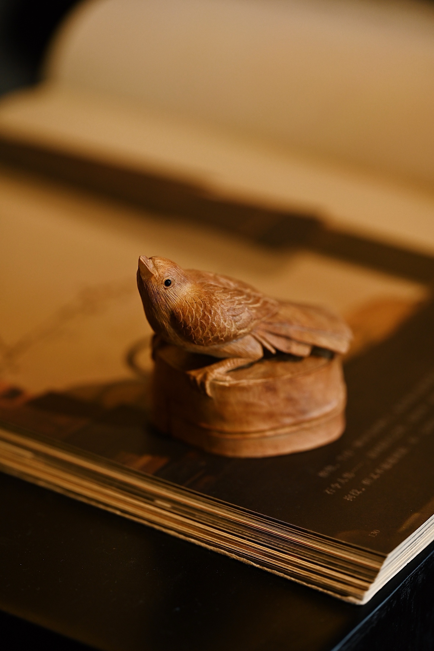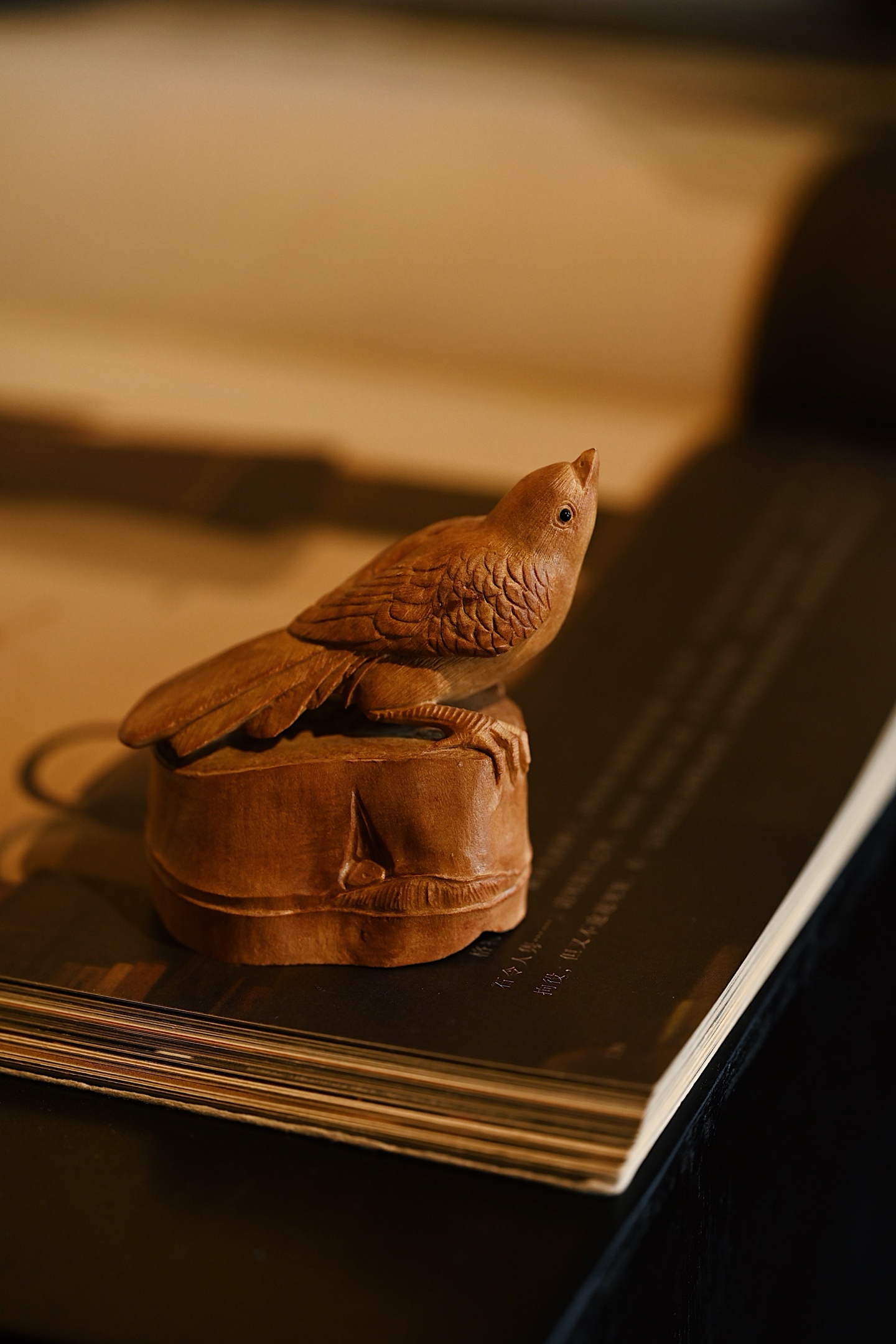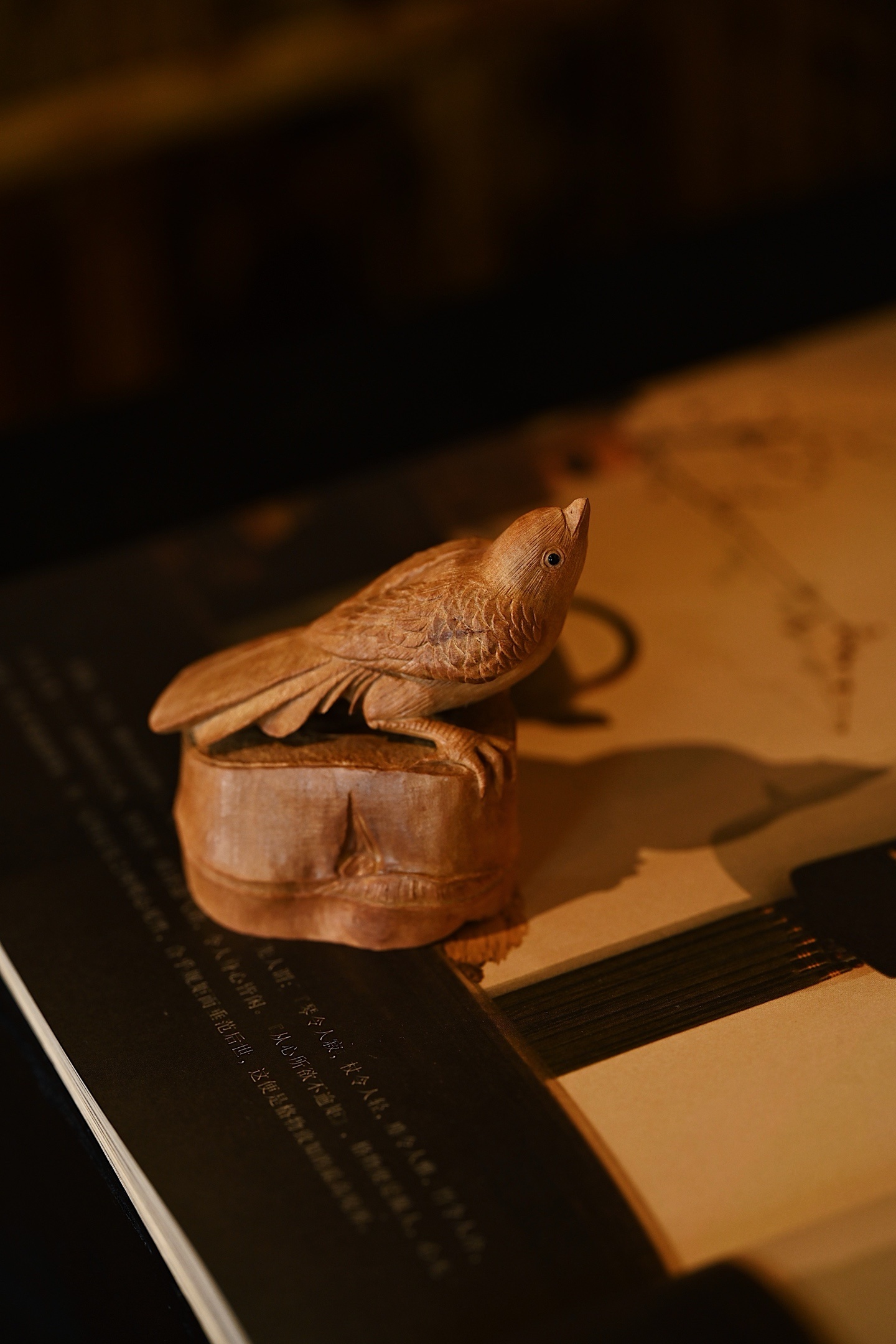 老山檀 | 雀语清音 小摆件雕工细腻,气韵灵动,鸣雀引颈啭鸣立于竹节之上,羽毛层