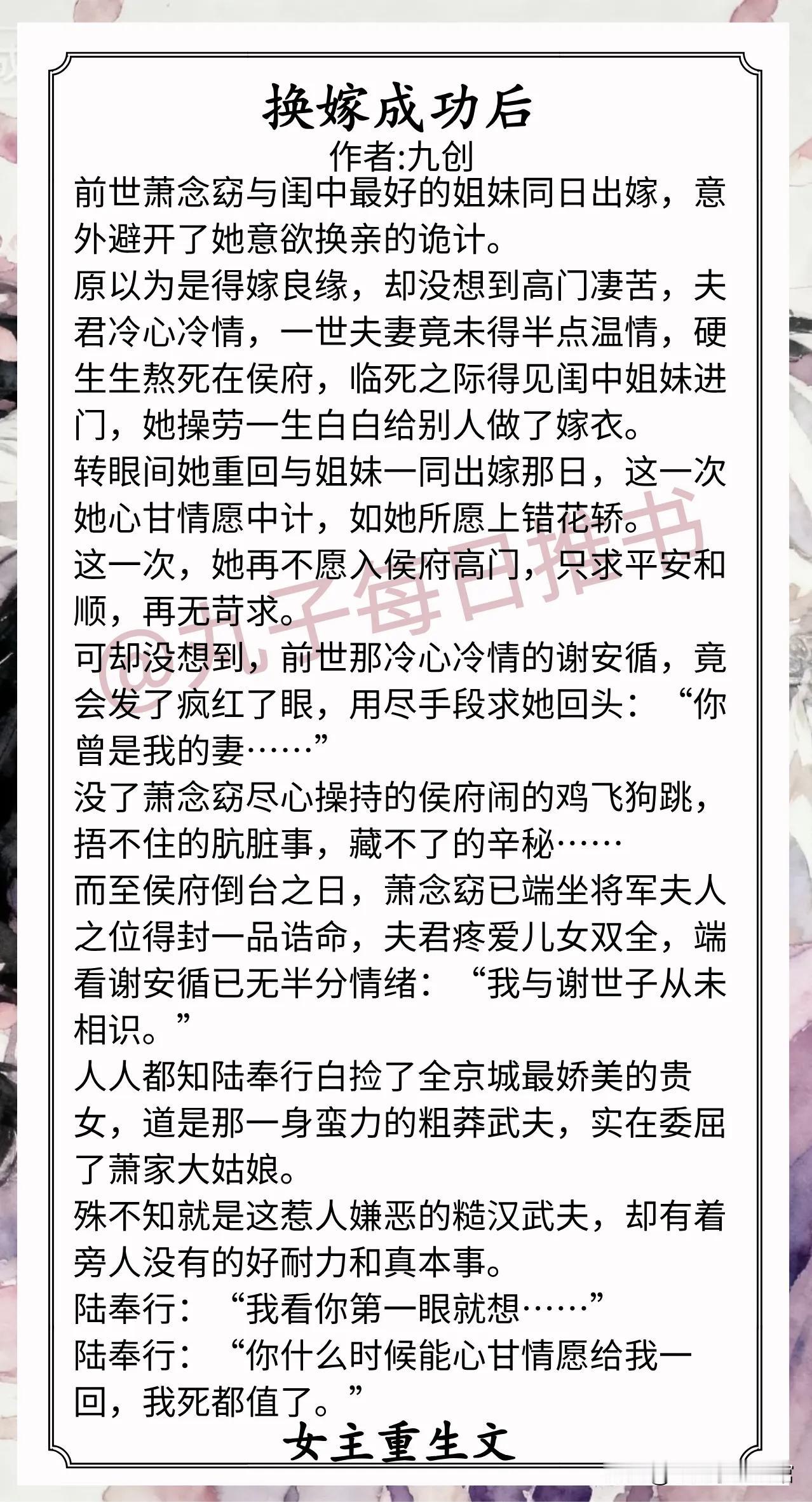 6.《换嫁成功后》作者:九创(娇美贵女vs粗莽武夫,重生,换嫁,先婚后爱,前任扬灰)