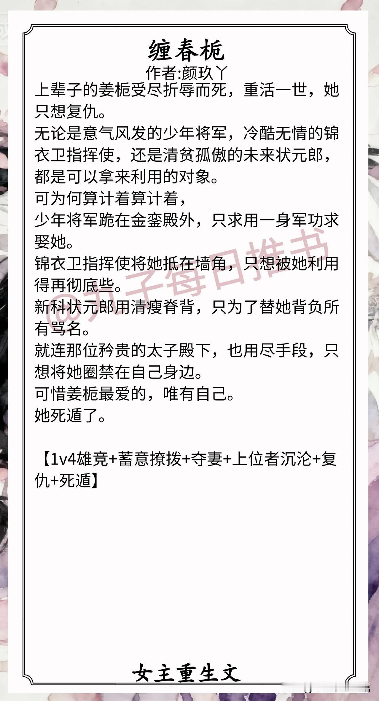 7.《缠春栀》作者:颜玖丫(心机美人,重生,复仇向,蓄意撩拨,上位者沉沦,1v4雄竞)