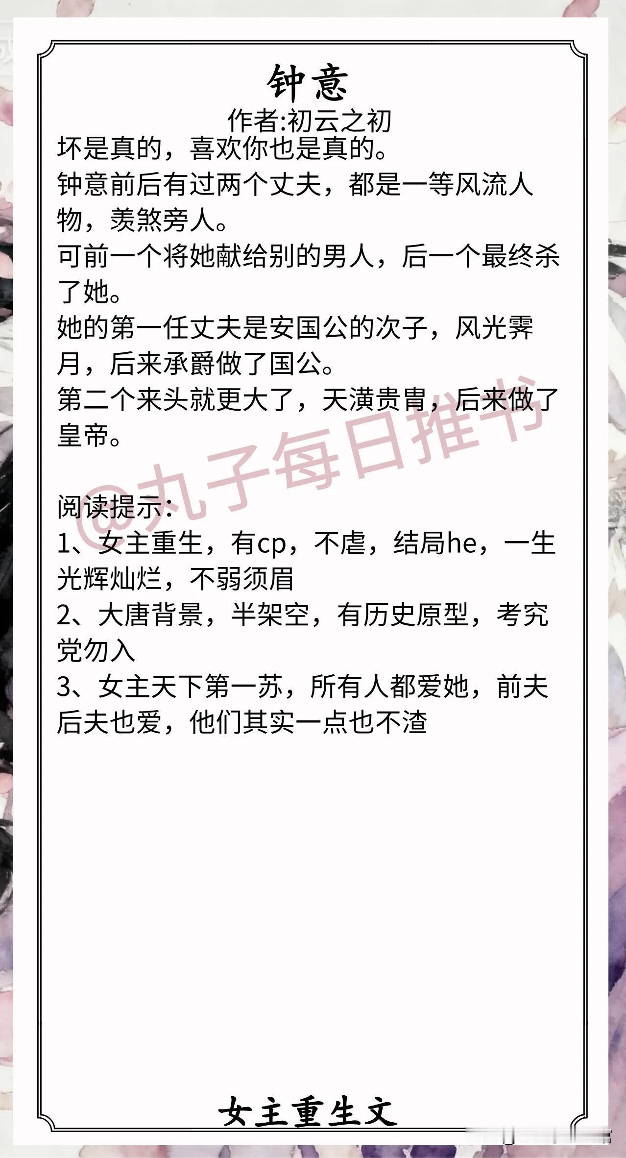 9.《钟意》作者:初云之初(端庄贵女vs霸道皇子,重生,前世君夺臣妻,今生死缠烂打,大唐背景)小说 推文