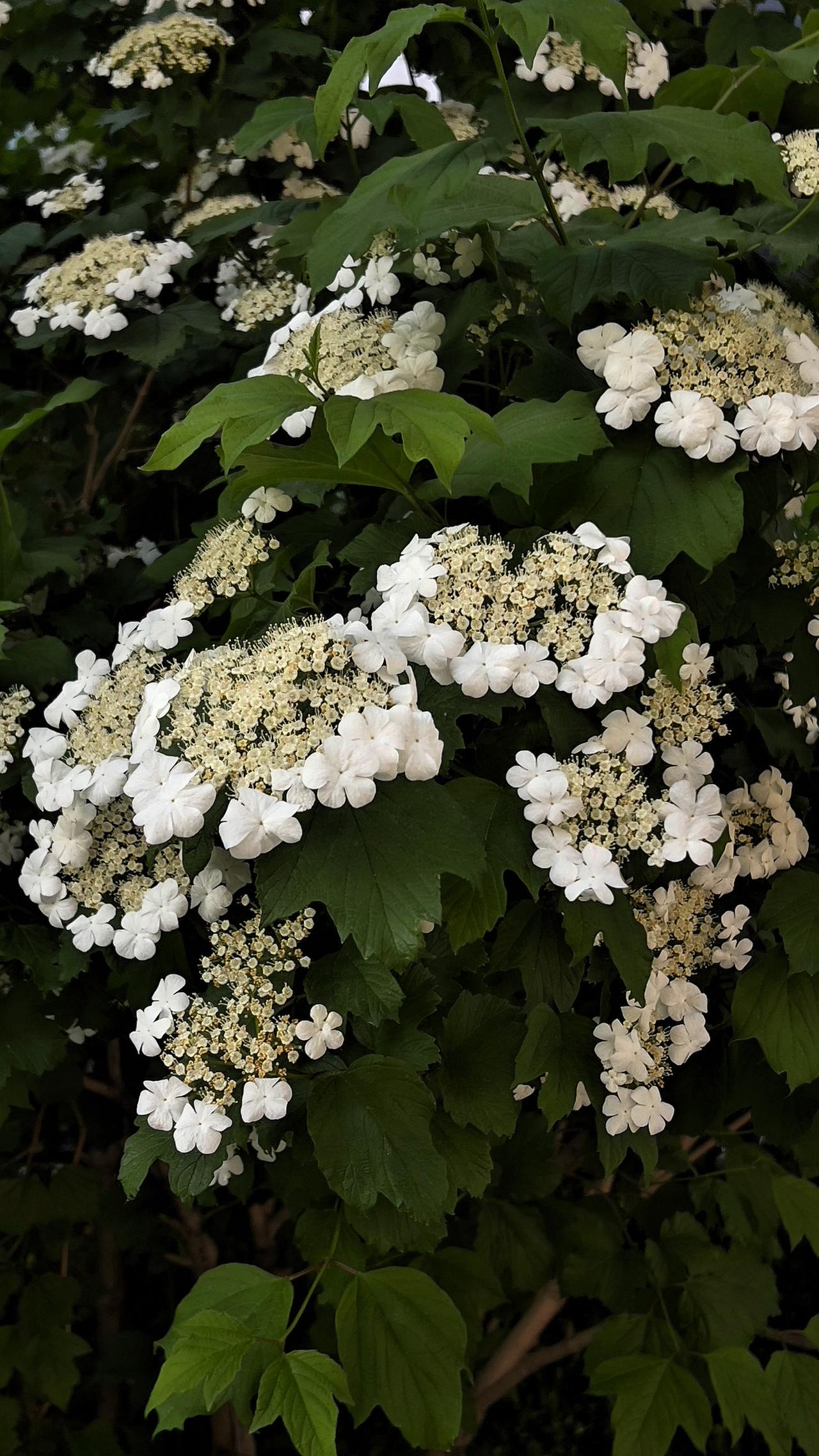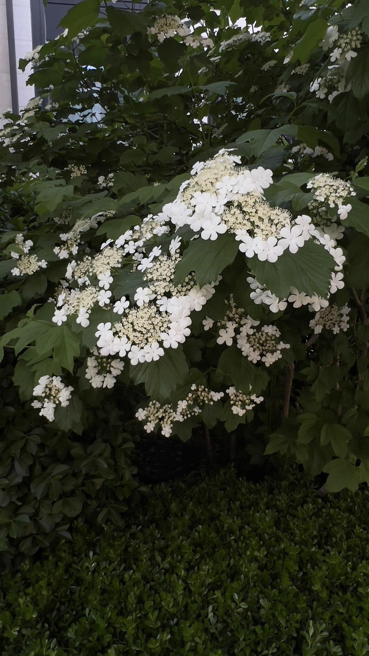 为我的真诚创作点赞!这是我在闺女家小区里拍摄到的白色花朵,查看了一下,白色花朵叫天目琼花,这开花的树叫鸡树条。