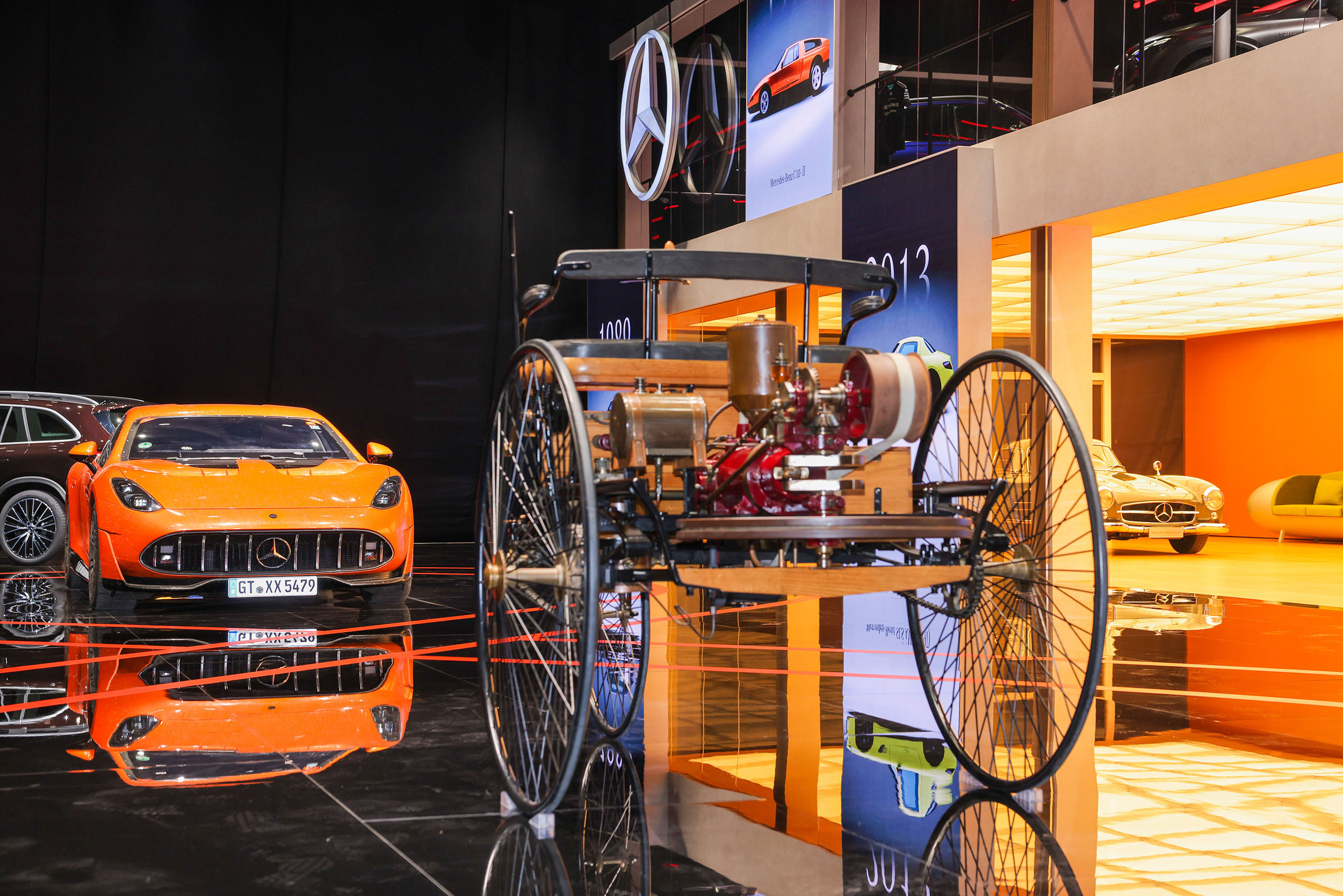 奔驰展台140周年的情怀和牌面,一口气搬了近40款车过来,甚至把12款跨时代传奇神车都拉到了现场,从1886年的奔驰一号,到经典的540K、鸥翼门300SL、"虎头奔"W140、迈巴赫62,直接把140年汽车发展史搬进展台。