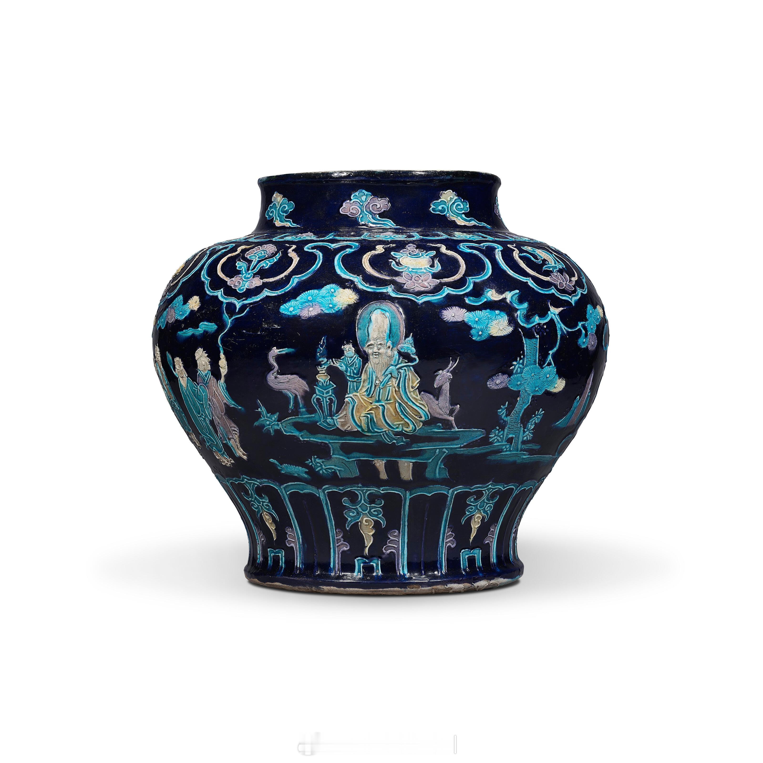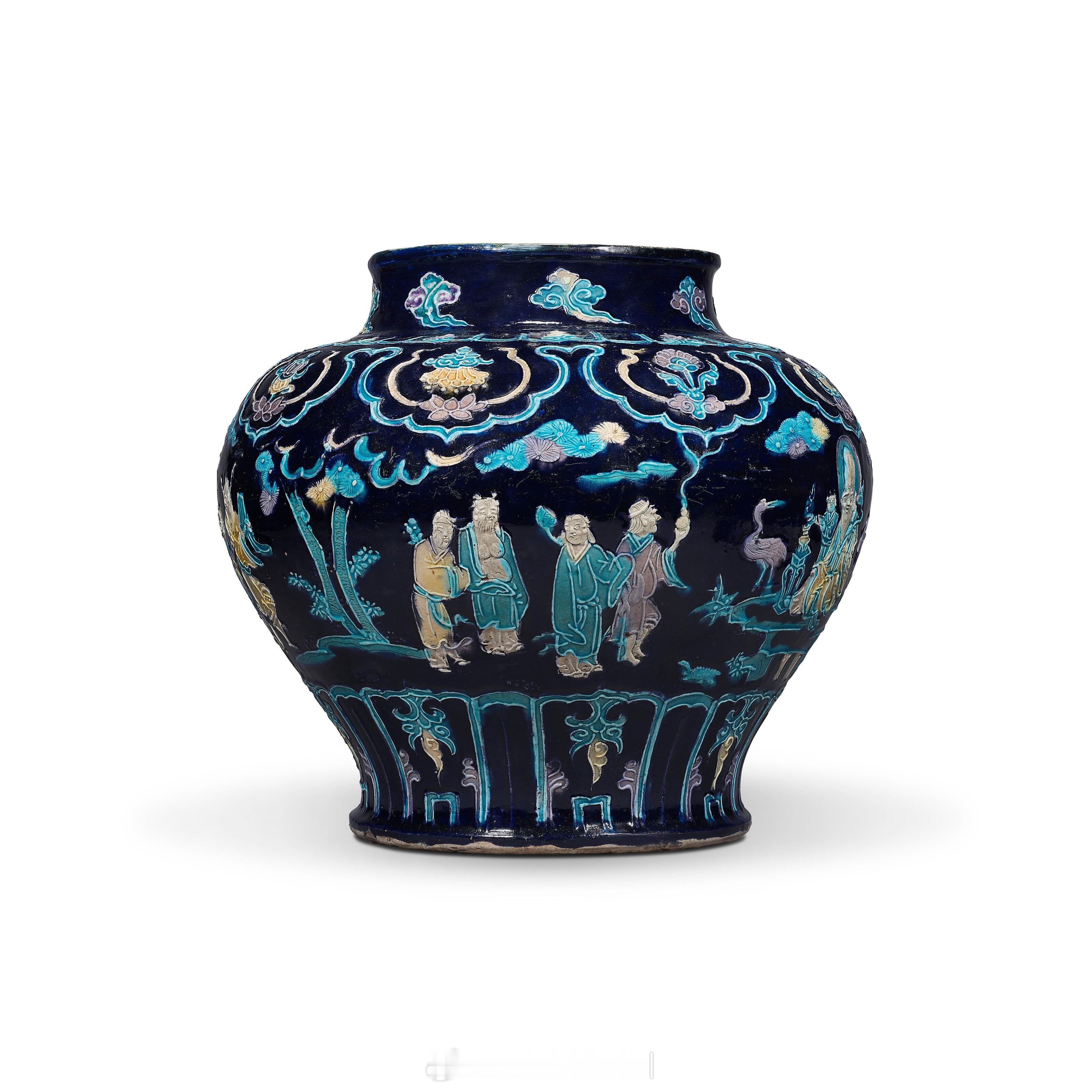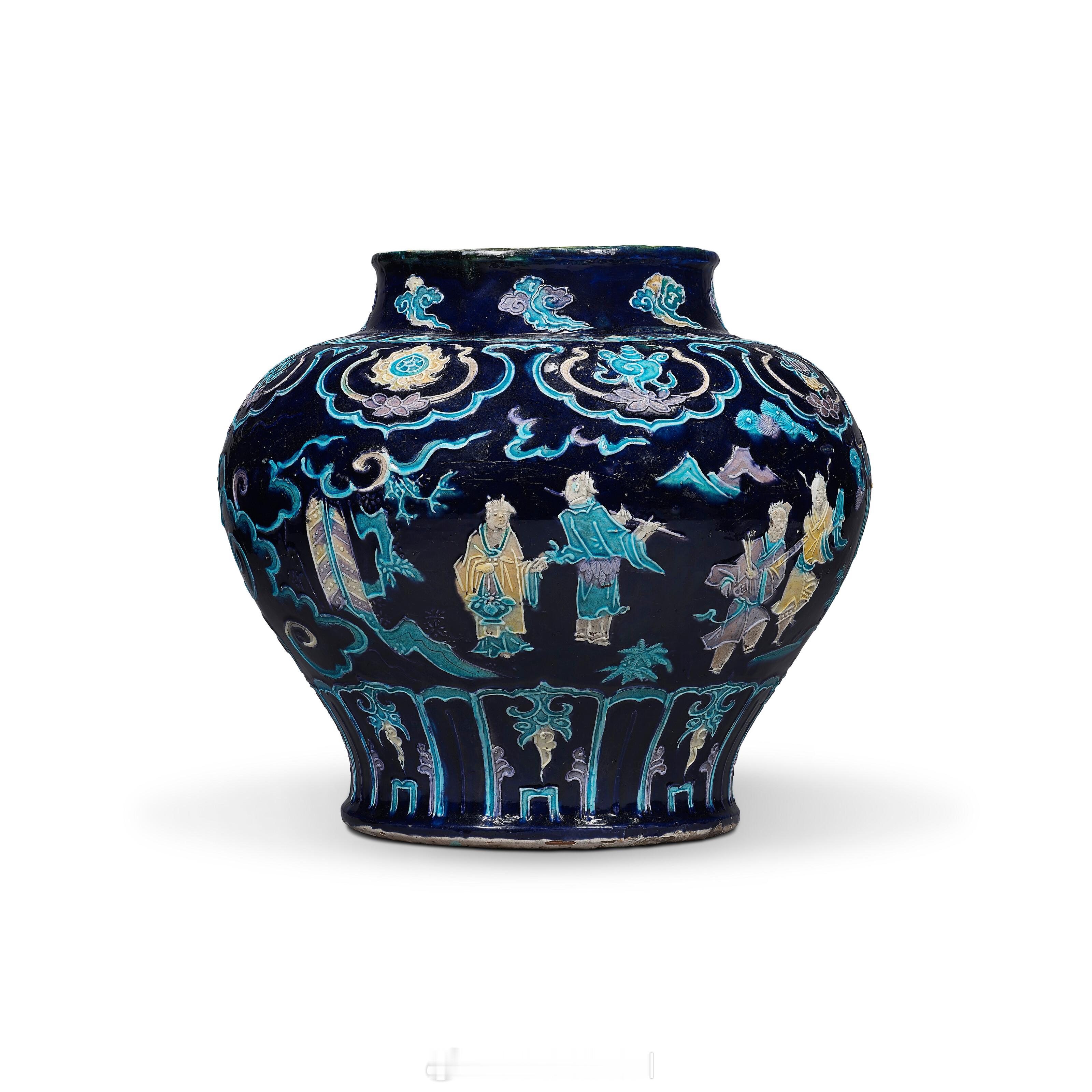 珐华运用了壁画使用的沥粉彩绘方法,先在经素烧的陶胎上用泥浆袋勾出凸起的纹饰之轮廓,经过素烧再于轮廓内填入各色釉料,二次入窑烧製而成。寿老八仙图为十五世纪末至十六世纪上珐华器上的经典纹饰。
