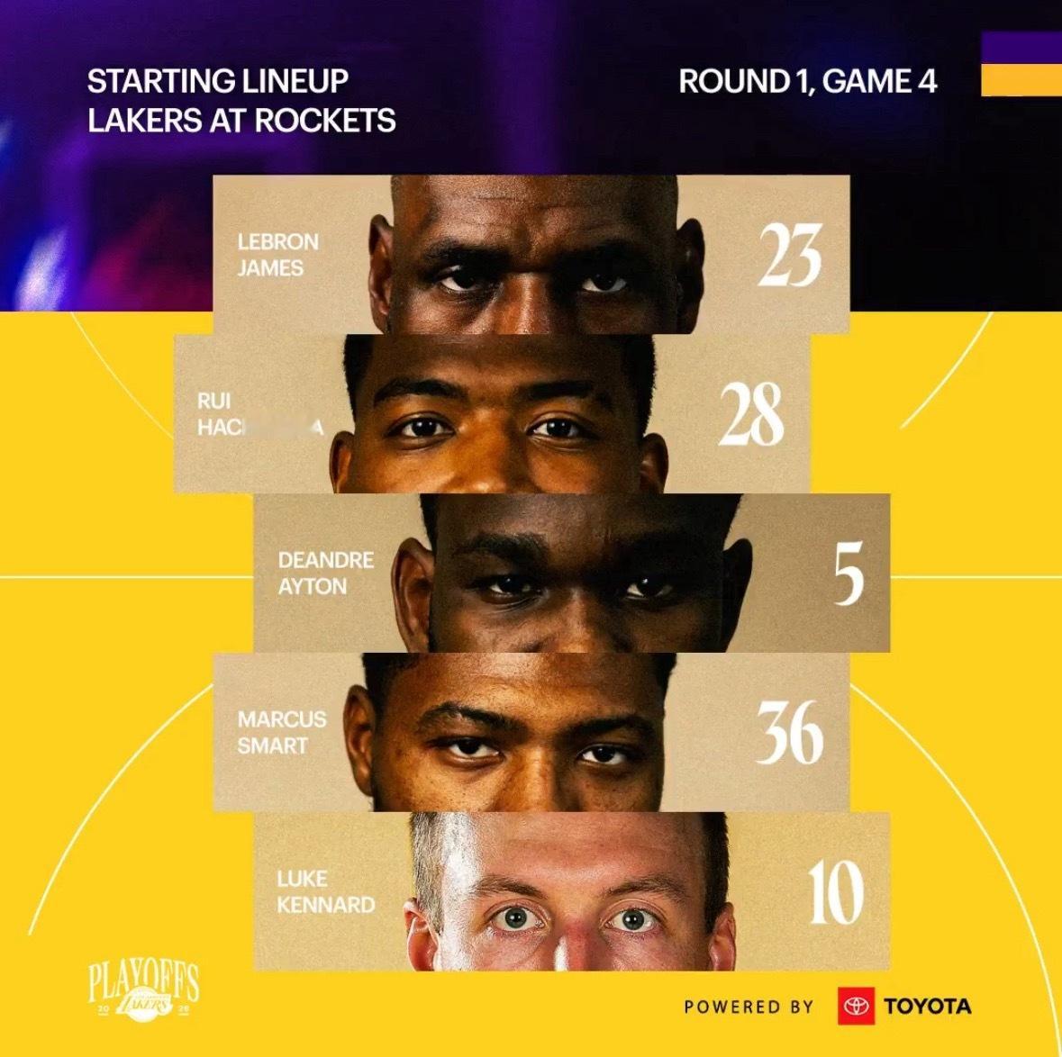 湖人首发:肯纳德、斯玛特、八村塁、詹姆斯、艾顿火箭首发:阿门、谢泼德、伊森、史密斯、申京
