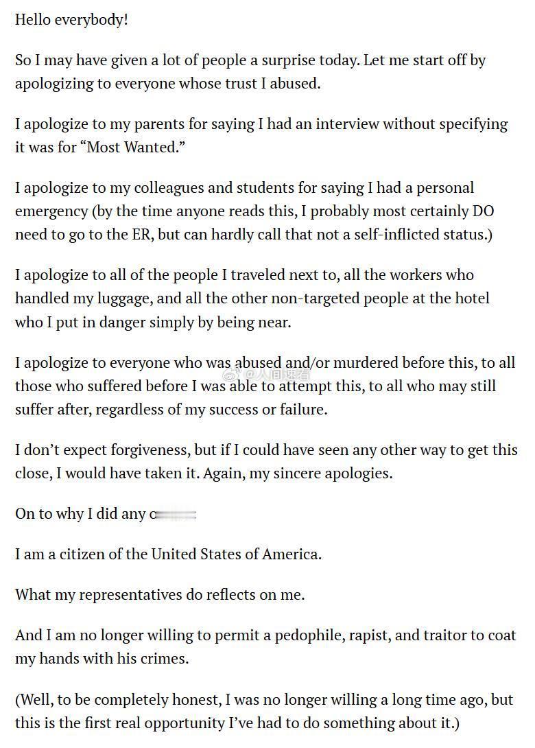 白宫枪手留字条呼吁袭击政府官员白宫枪击案嫌疑人作案动机白宫记者晚宴枪击案嫌犯、31岁的科尔·托马斯·艾伦的宣言已对外公布,文中他将特朗普总统称作“恋童癖、强奸犯与叛国者”。在详述作案动机时,他写道:“我再也无法容忍一名恋童癖、强奸犯、叛国者,让我沾染他的罪行。”他同时列明了袭击目标: