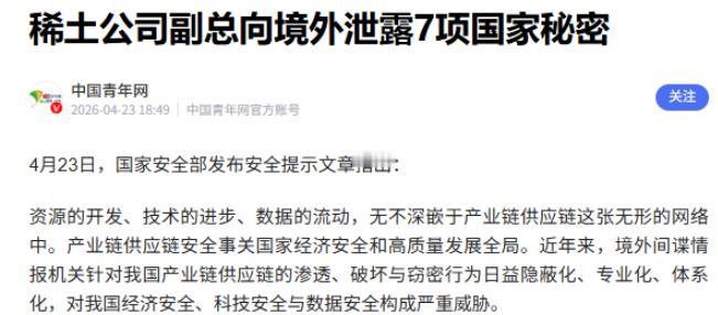 谁能想到,咱们引以为傲、能在全球横着走的“国之重器”,竟然被自己人给卖了?4月23日,国家安全部披露的一桩惊天大案,直接把大伙儿看出一身冷汗。一家稀土公司的副总见钱眼开,竟把7项绝密数据打包送给了境外机构,这就好比咱们正跟对手在牌桌上梭哈,底牌却被内鬼掀了个底朝天!