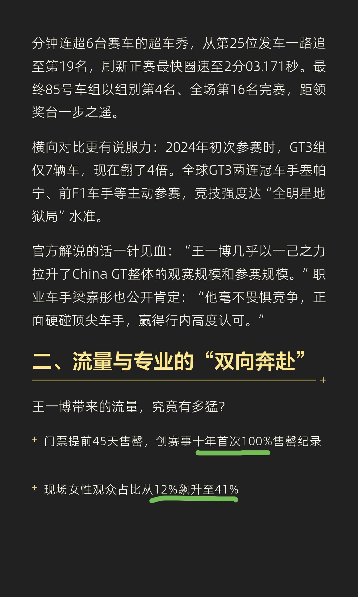 有了ctcc对比,更能知道王一博以一己之力带动赛车行业迈向新纪元的含金量有多高。相比去年,王一博的号召力、关注度和商业价值都上了不止一个台阶。这次的CGT售票盛况,就是最有力的证明。他的影响力早已突破单一领域,形成了一个稳固的“同心圆”结构,并开始产生强大的复合效应,粉丝、影迷、车迷、户外迷、时尚爱好者……多个圈层的人群在此次赛事中汇聚,共同促成了“开票即售罄”的盛况
