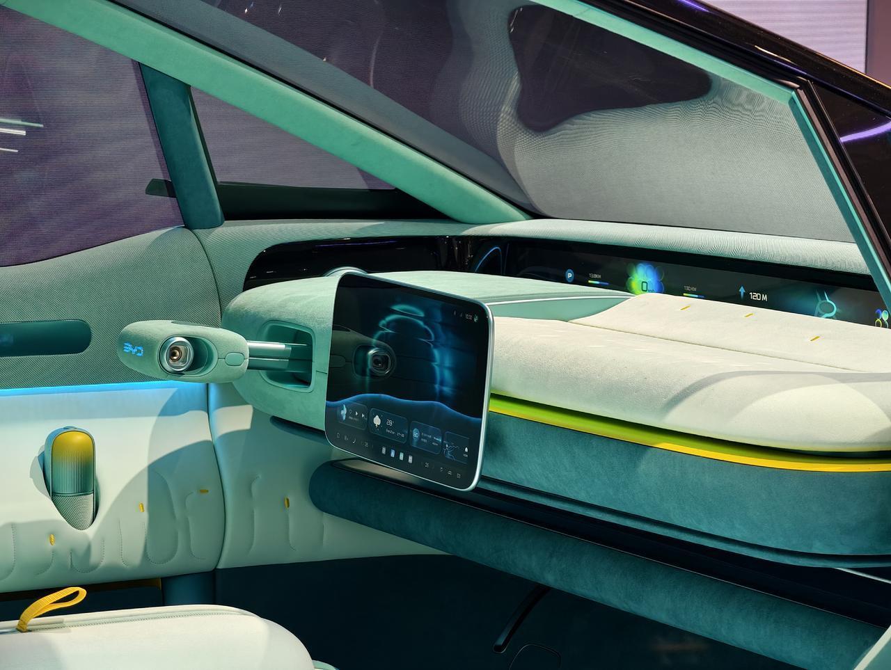 它的中控台也大有玄机,中控屏幕还可以左右滑动。还能够一键进入“海洋观影模式”,通过翻转隐藏方向盘、显示屏,并展出大尺寸投屏,解锁更多的出行玩法。它的方向盘可以单独收放,推测可能是为了展示前瞻研究,结合发布会上所说的“未来出行座舱”,应该就是指L4级自动驾驶技术。