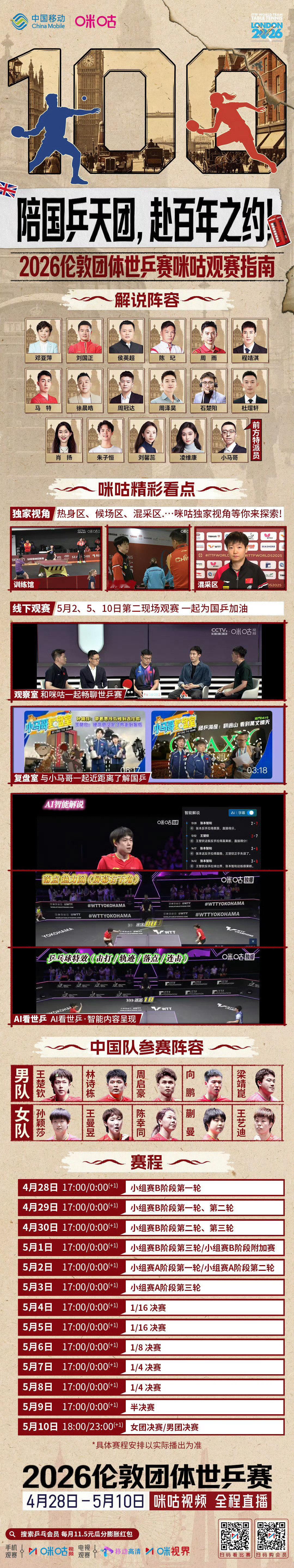 🌟4月18日-5月4日:2026年斯诺克世锦赛;🌟4月24日-5月3日:2026年汤姆斯杯&尤伯杯🌟4月28日-5月10日:2026伦敦世乒赛团体赛🌟5月1日-3日:国际泳联跳水世界杯总决赛🌟5月1日-6日:中超联赛第9、10轮🌟5月1日-4日:欧洲五大联赛争冠季🌟4月19日起:NBA季后赛 🌟5月2日、10日:UFC格斗之夜珀斯站、UFC328