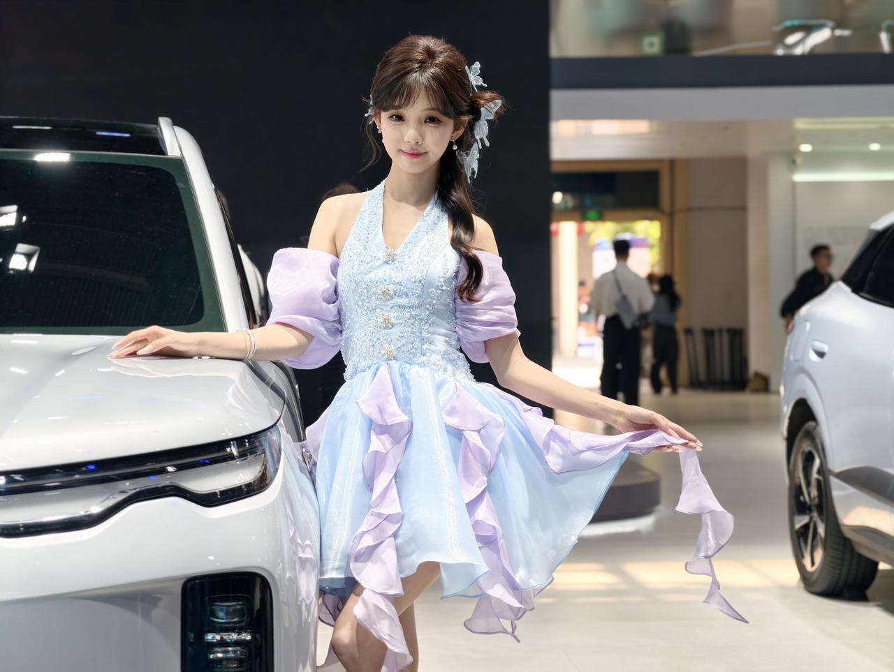 不是萌妹纸车模身形小家碧玉,我要告诉你,这车长5.115米、宽1.999米、高1.800米,你就知道这个模特是位1米7的高个(当时是站在车头位置,略微仰拍)了。模特好看,车同样也很好看。