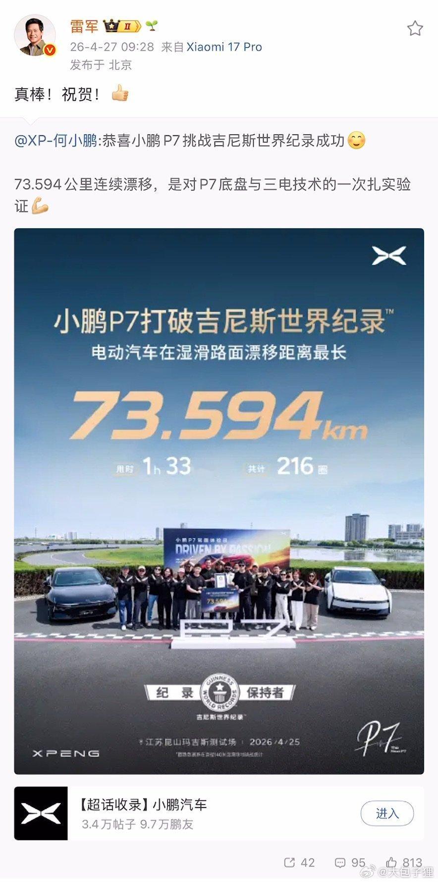 年轻人的第一次漂移,你不来试试?雷军祝贺小鹏P7破世界纪录小鹏P7又创吉尼斯世界纪录