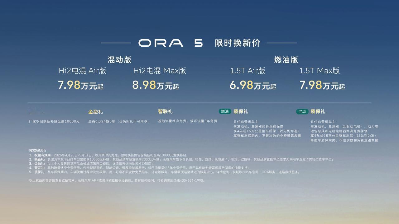 4月25日,欧拉5多动力版本车型上市。其中混动版推出2款车型,售价8.98-9.98万元,限时换新价7.98-8.98万元;燃油版推出2款车型,售价7.98-8.98万元,限时换新价6.98-7.98万元;此外,欧拉5还推出侯明昊限定版,共推出燃油、混动、纯电三种动力形式的3款车型,售价8.98-13.38万元。欧拉5摒弃品牌以往“猫系”可爱风格,采用中性化、国际化的“自然美学”设计语言,车身尺寸4471x1833x1641mm,轴距2720mm,兼顾灵活性与内部空间。智能化方面,配备第三代Coffee Pilot 3辅助驾驶系统,是10万元级别首款配备激光雷达的车型,可实现不依赖高精地图的城市NOA功能及3公里跨楼层记忆泊车,同时集成Coffee OS 3系统与双大模型,智能交互体验大幅提升。作为首款基于长城全新全球化平台打造的车型,欧拉5具备“一车多动力”能力,此次车展除纯电版本外,混动版、燃油版也同步亮相,未来将覆盖多元动力需求。值得一提的是,官方还在发布会上表示,欧拉5还将推出运动款车型,该车型拥有双色车身和全新的双五辐式轮圈,并提升车辆操控性能。懂车帝车友圈【来自懂车帝车友圈】