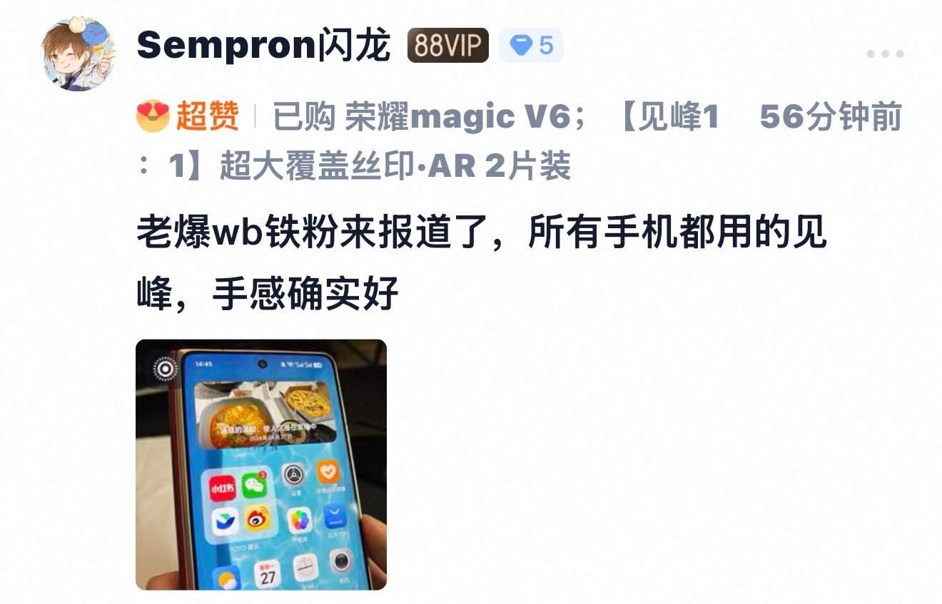 感谢老铁晒单支持荣耀 Magic V6 见峰 1:1 玻璃 AR 膜,这接近于全