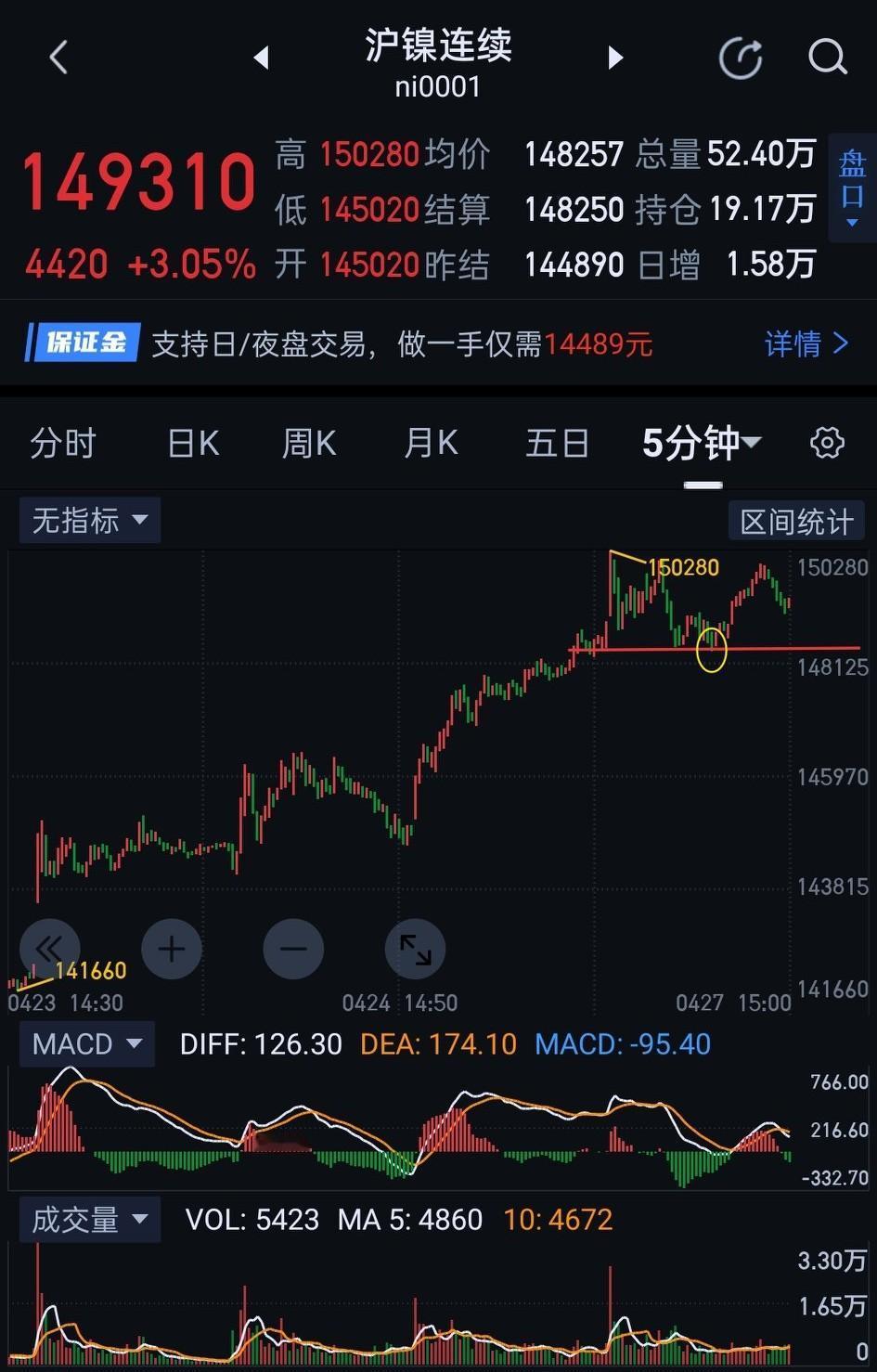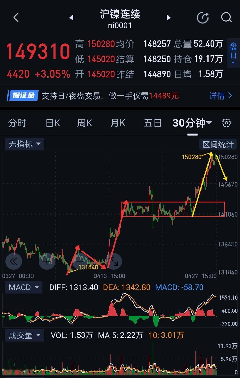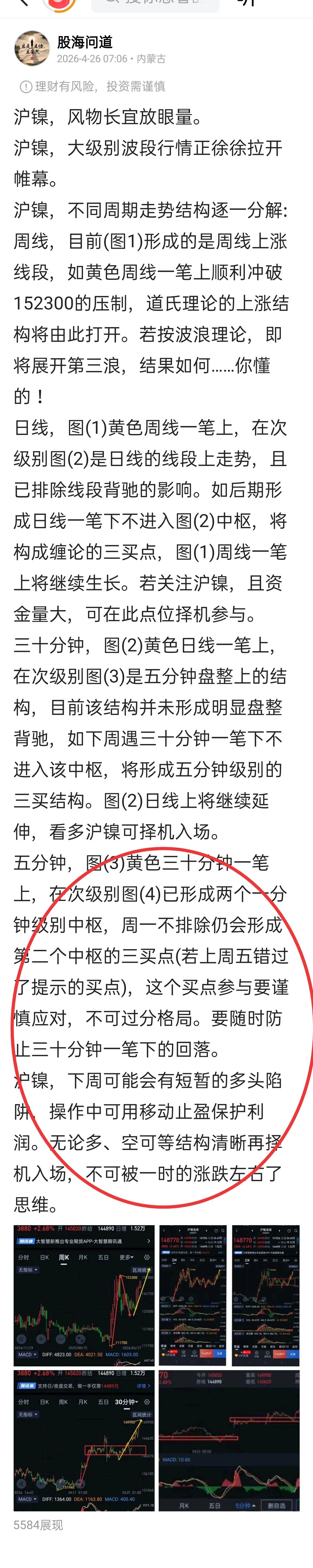 沪镍,夜盘多一分清醒,少一分醉。 沪镍,日盘高位震荡,盘中形成图(1)第二个一分钟中枢的三买点。沪镍夜盘要防止主力借此设置多头陷阱。 沪镍,夜盘(图2)148320能否有效站稳是关键。站稳,用移动止盈保护利润,观察沪镍在150280上方是否形成一分钟级别趋势背驰。若不能站稳148320,将形成图(3)三十分钟一笔下的回踩,后期观察是否能形成图(3)中枢的三买结构。 沪镍夜盘,多、空面临阶段切换节点,操作上需谨慎应对。更多详细内容可参考图(4)周评。(图中黄色线段属于待确认走势)