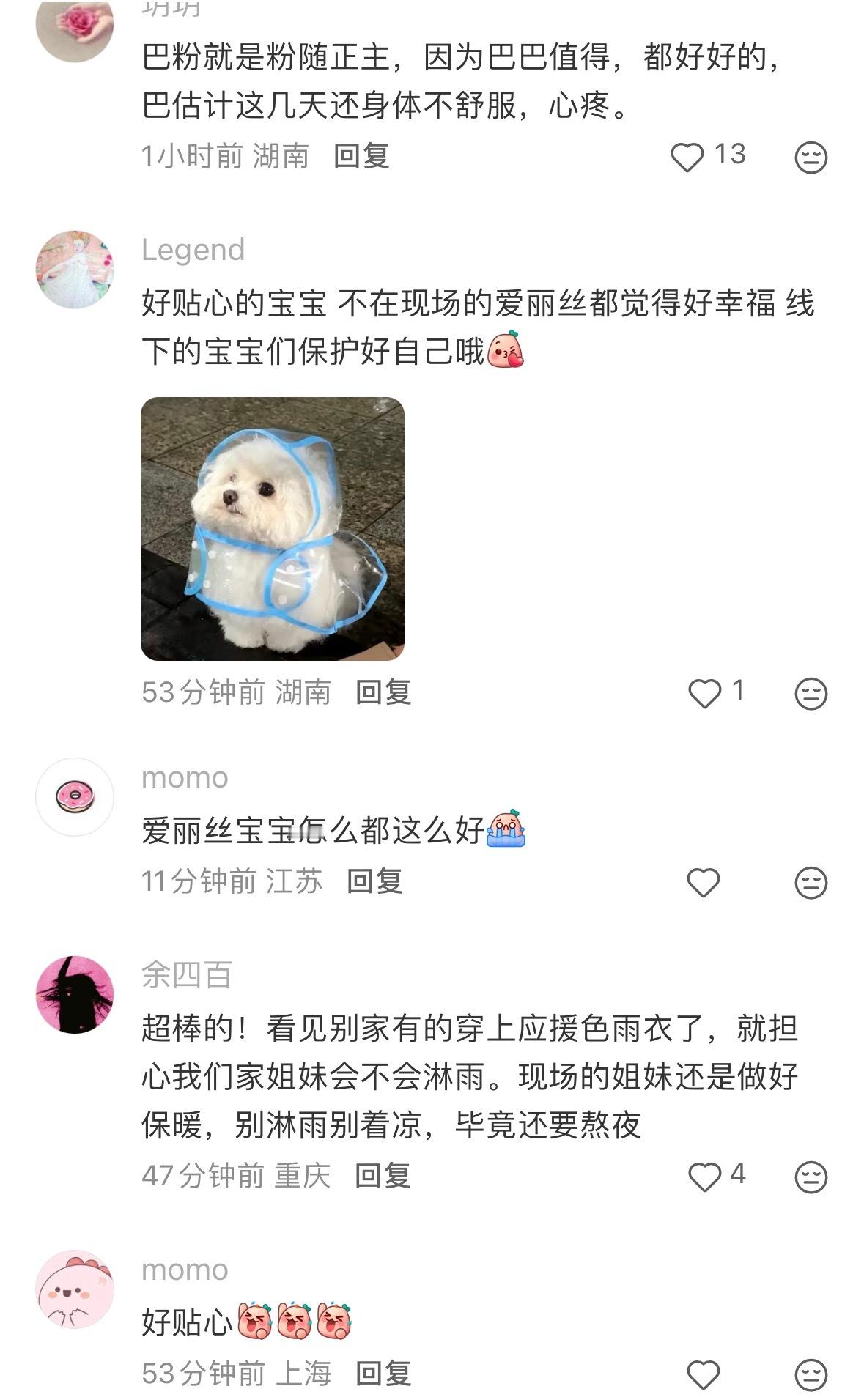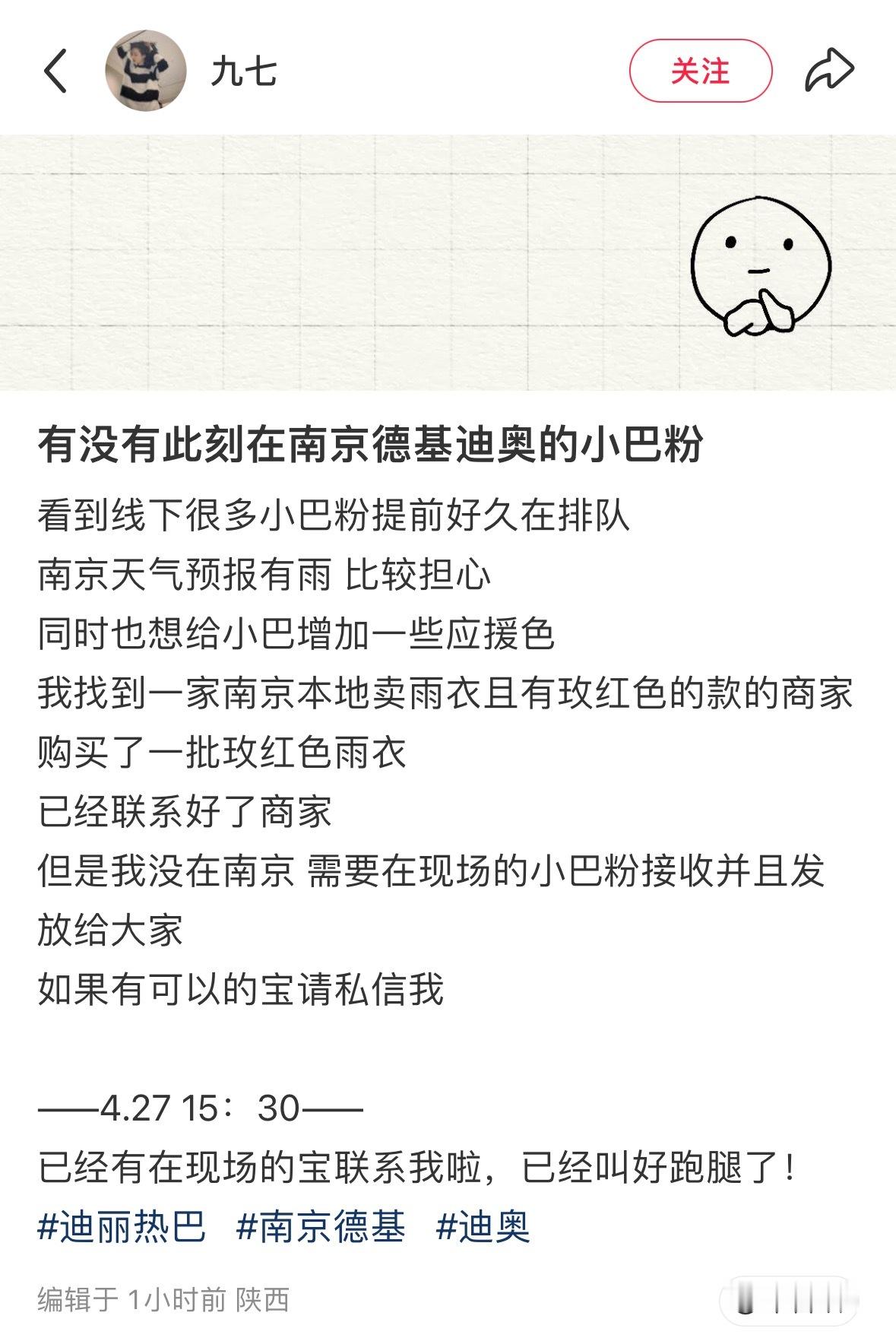 哎!我们家女孩真好🥹外地的巴粉担心自家妹子淋雨,专门找了当地的店铺订迪丽热巴应援色雨衣发给去线下的粉丝。一群陌生人因为同样爱着一个人聚在一起,真的好伟大!
