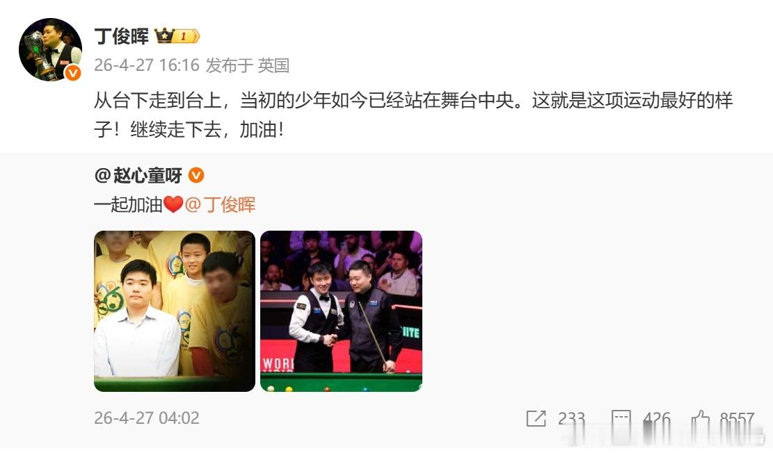 04月27日讯 斯诺克世锦赛16进8阶段,赵心童13-9淘汰丁俊晖,赛后赵心童晒出了自己儿时与丁俊晖的同框照,以及现今比赛时和丁俊晖的合照,并配文:一起加油❤️,丁俊晖也转发了这条微博。