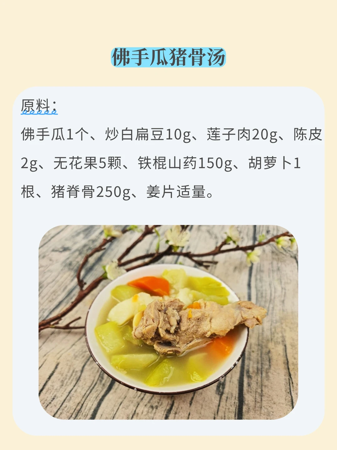 原料:佛手瓜1个、炒白扁豆10g、莲子肉20g、陈皮2g、无花果5颗、铁棍山药150g、胡萝卜1根、猪脊骨250g、姜片适量。