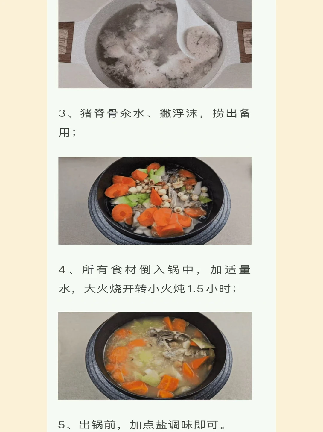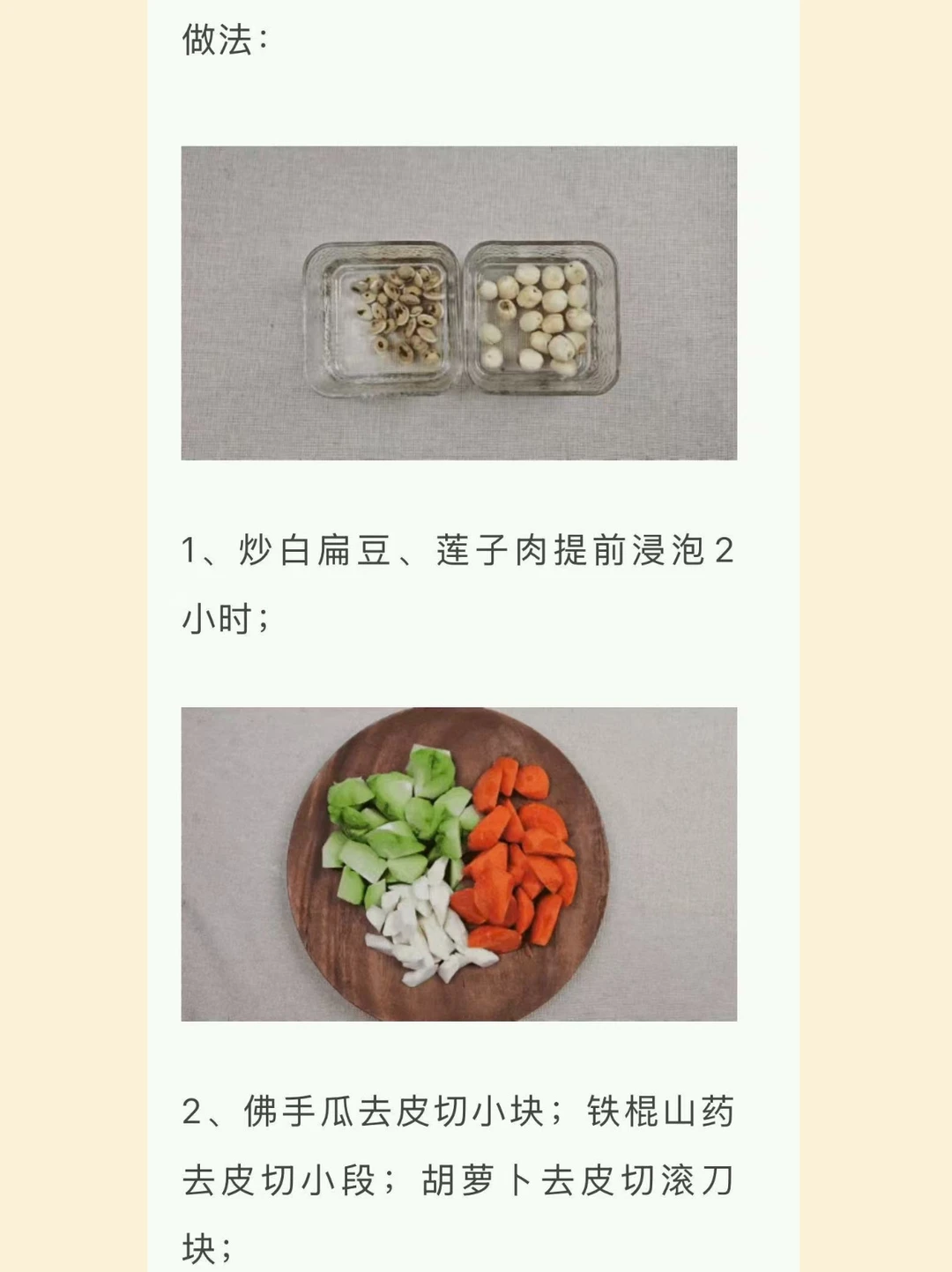 [向右R]做法:炒白扁豆、莲子肉提前浸泡2小时;佛手瓜去皮切小块;铁棍山药去皮切小段;胡萝卜去皮切滚刀块;猪脊骨汆水、撇浮沫,捞出备用;所有食材倒入锅中,加适量水,大火烧开转小火炖1.5小时;出锅前,加点盐调味即可。