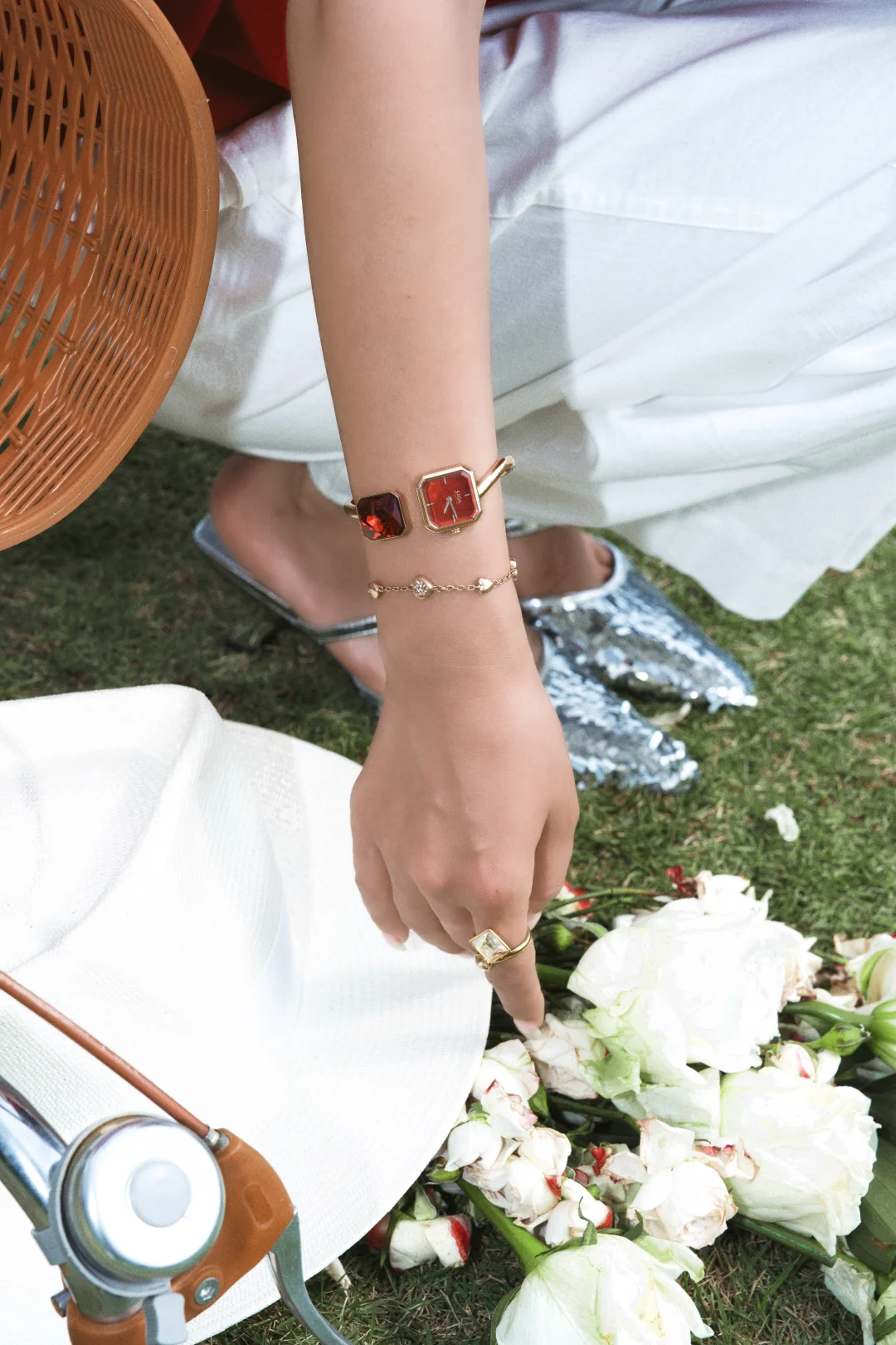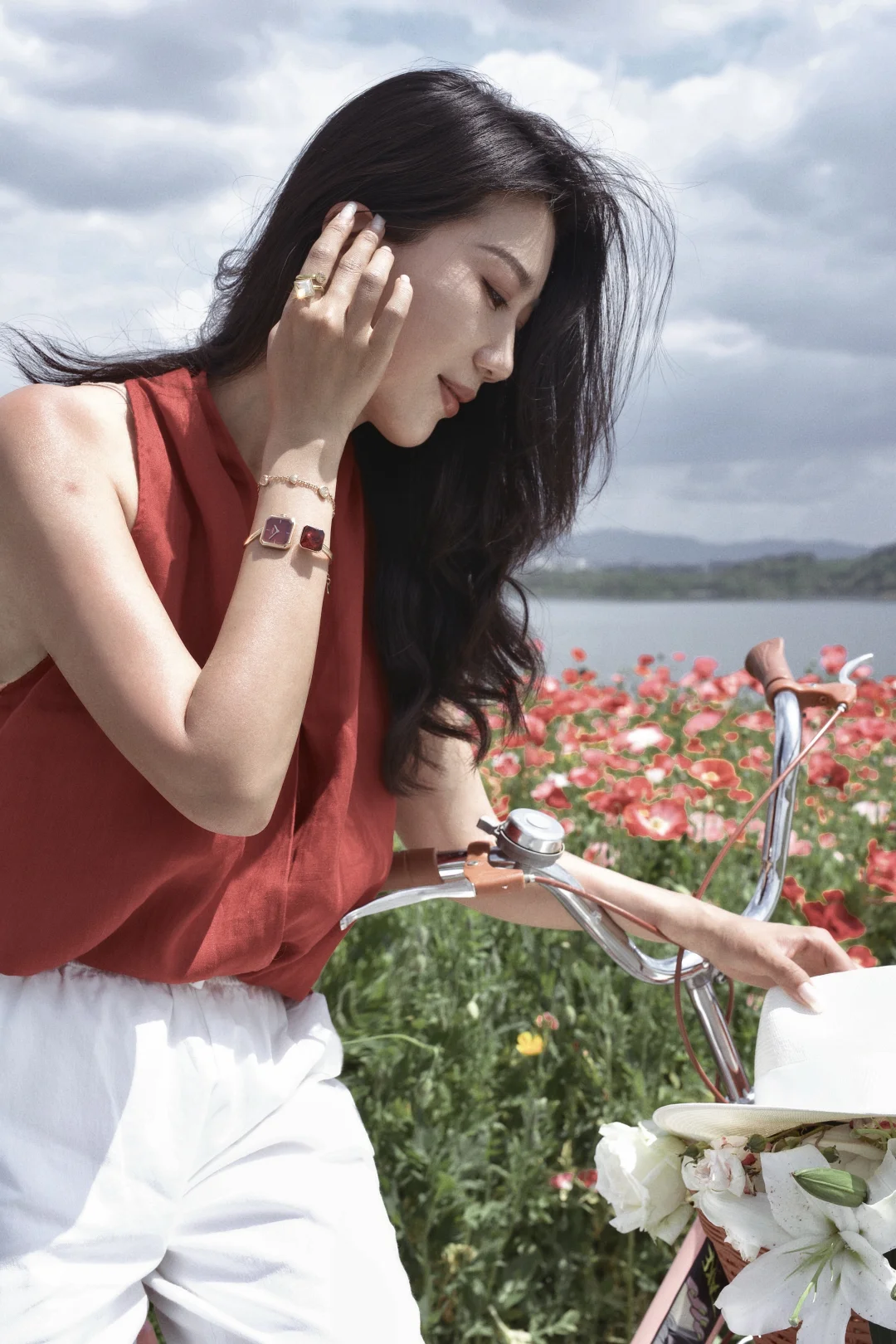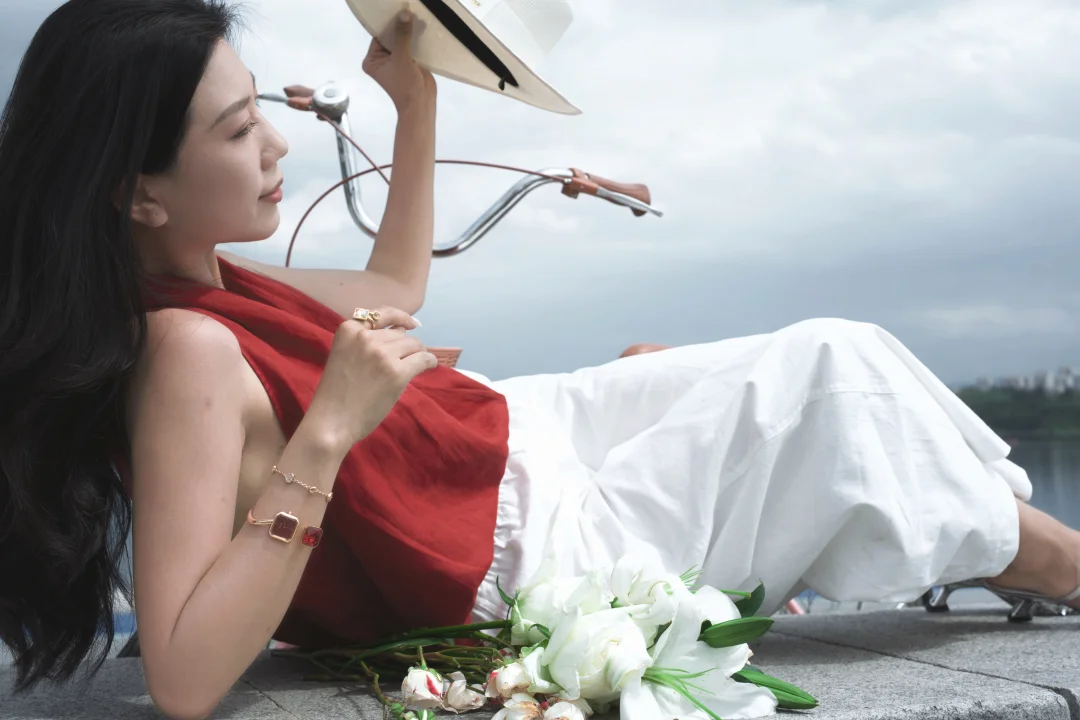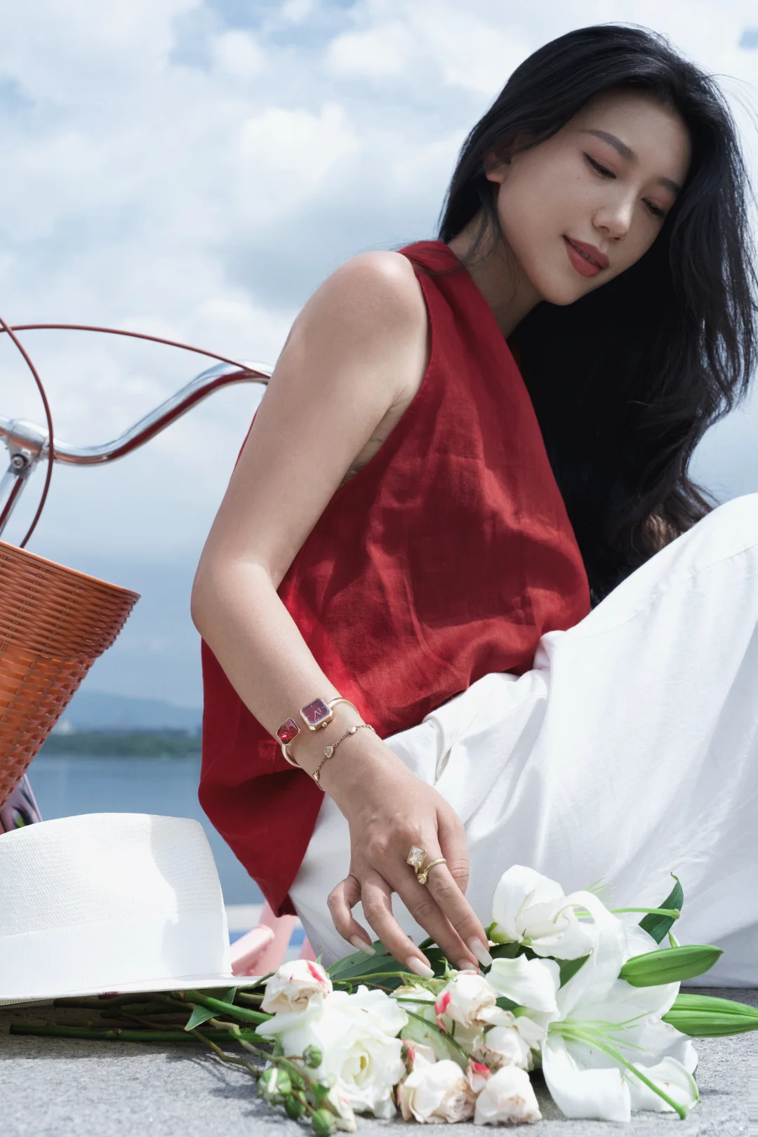 红与白的松弛穿搭,适配所有出行场景。腕间的SAGA手镯表,以马蒂斯红八角形表盘为韵,热烈又高级;旺多姆之光的造型别致灵动,金框勾勒出优雅轮廓,与细链叠戴,温柔中藏着力量。