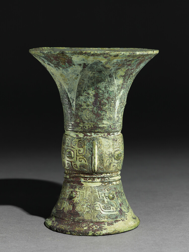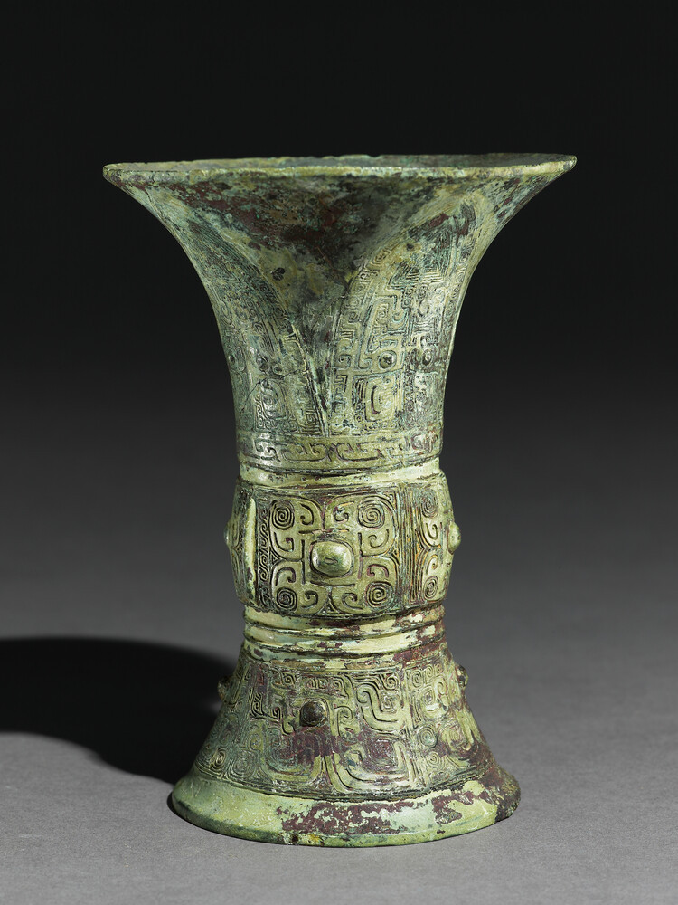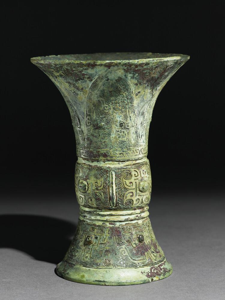 每天一件青铜器 牛津大学阿斯莫兰美术馆藏商晚期:目纹尊. 这类以目纹为中段主纹饰的尊屈指可数, 比较稀有. 目纹眼睛凸出, 四周有四瓣分裂的如同叶片一样的装饰. 尊的足段是鸟喙龙纹, 上段则是龙纹组成的三角蕉叶纹. 几乎满工的作品