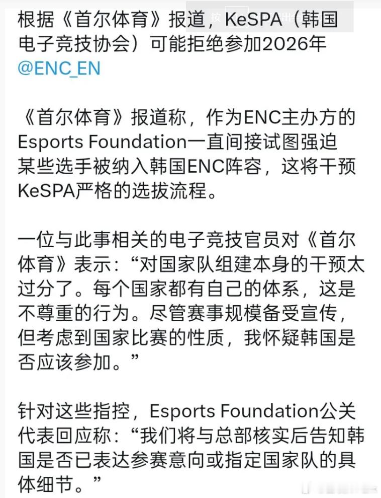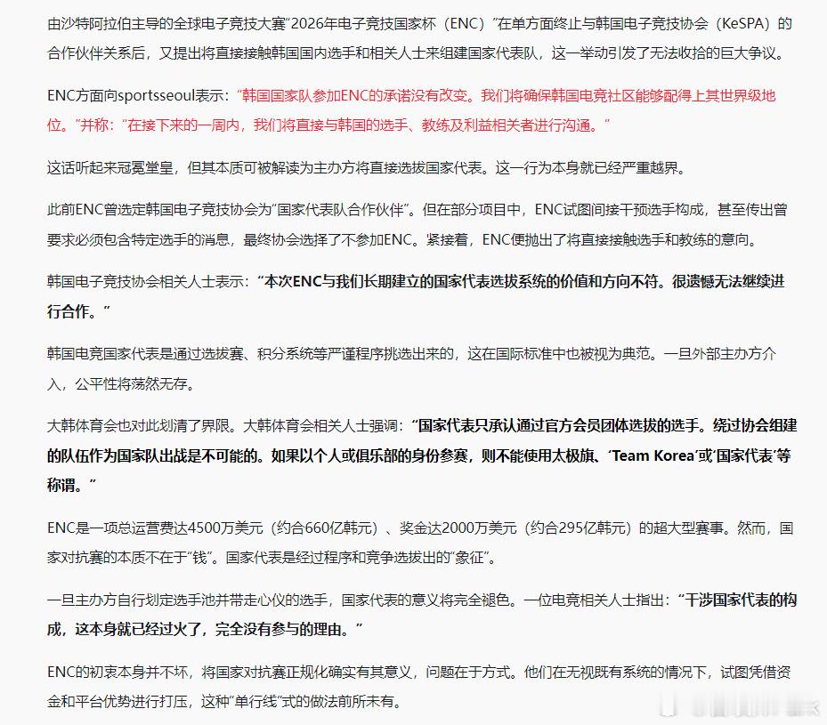 此前韩媒爆料沙特主导的2026年电子竞技国家杯(ENC)干涉韩国国家队选人,所以决定放弃ENC,后续来了!ENC回怼韩国电竞协会KeSPA:终止和KeSPA的合作,韩国国家队参加ENC的承诺没有改变,在接下来的一周内,我们将直接与韩国的选手、教练及利益相关者进行沟通!大韩体育会相关人士:国家代表只承认通过官方会员团体选拔的选手。绕过KeSPA组建的队伍作为国家队出战是不可能的。如果以个人或俱乐部的身份参赛,则不能使用太极旗、‘Team Korea’或‘国家代表’等称谓!!