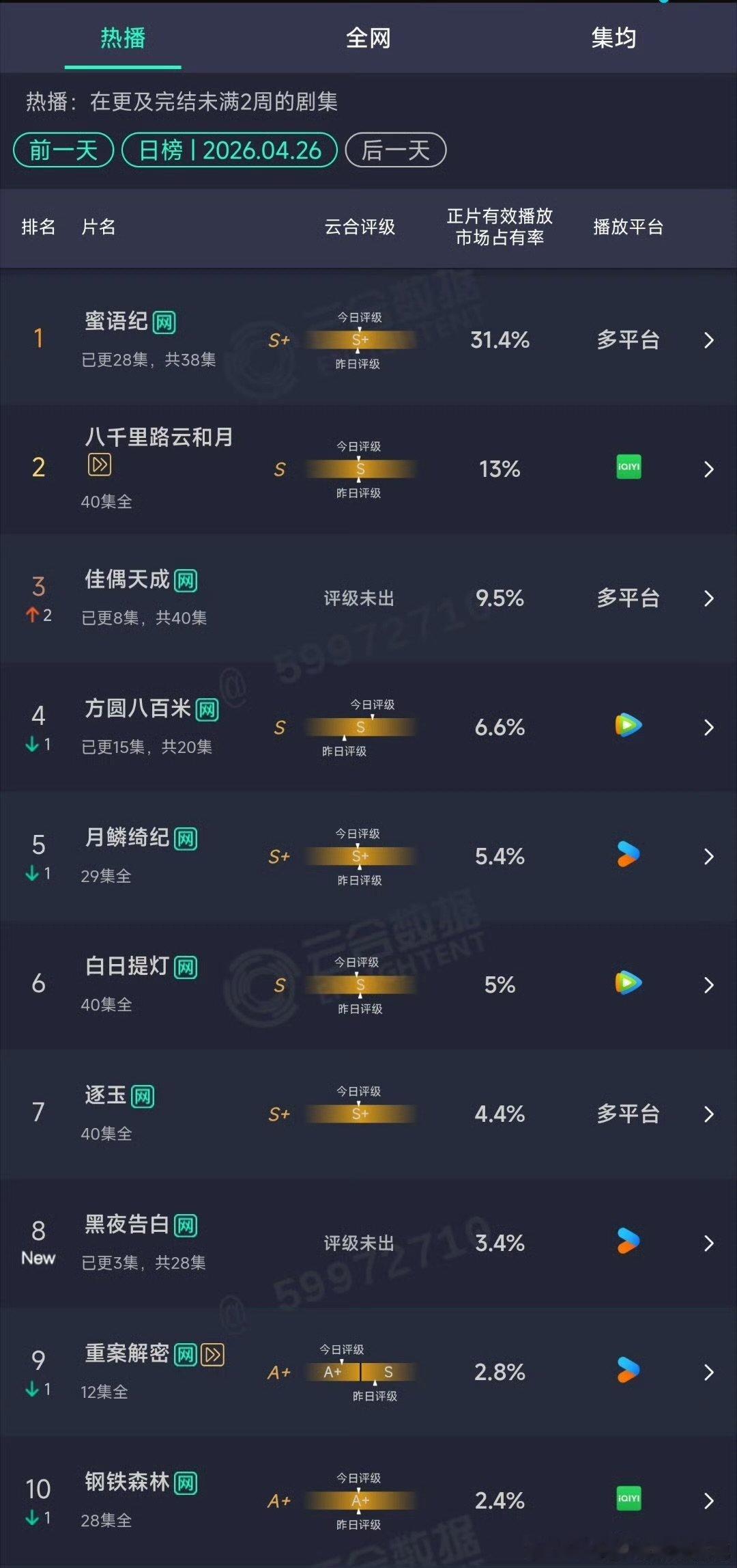 黑夜告白云合占比3.4%黑夜告白首播云合3.4%全新悬疑力作重磅上线,叙事节奏恰到好处,内容品质过硬,稳步积攒超高路人缘