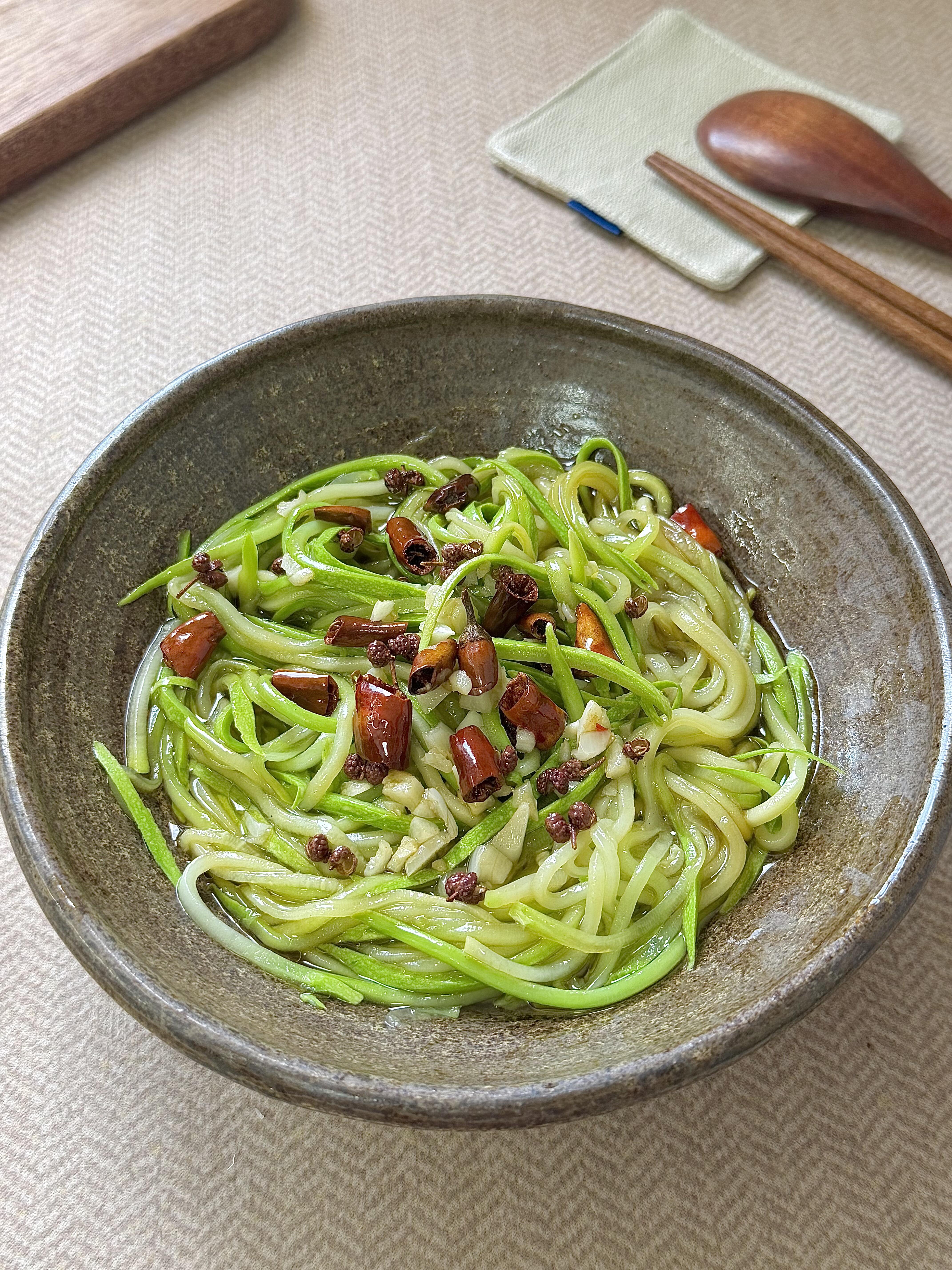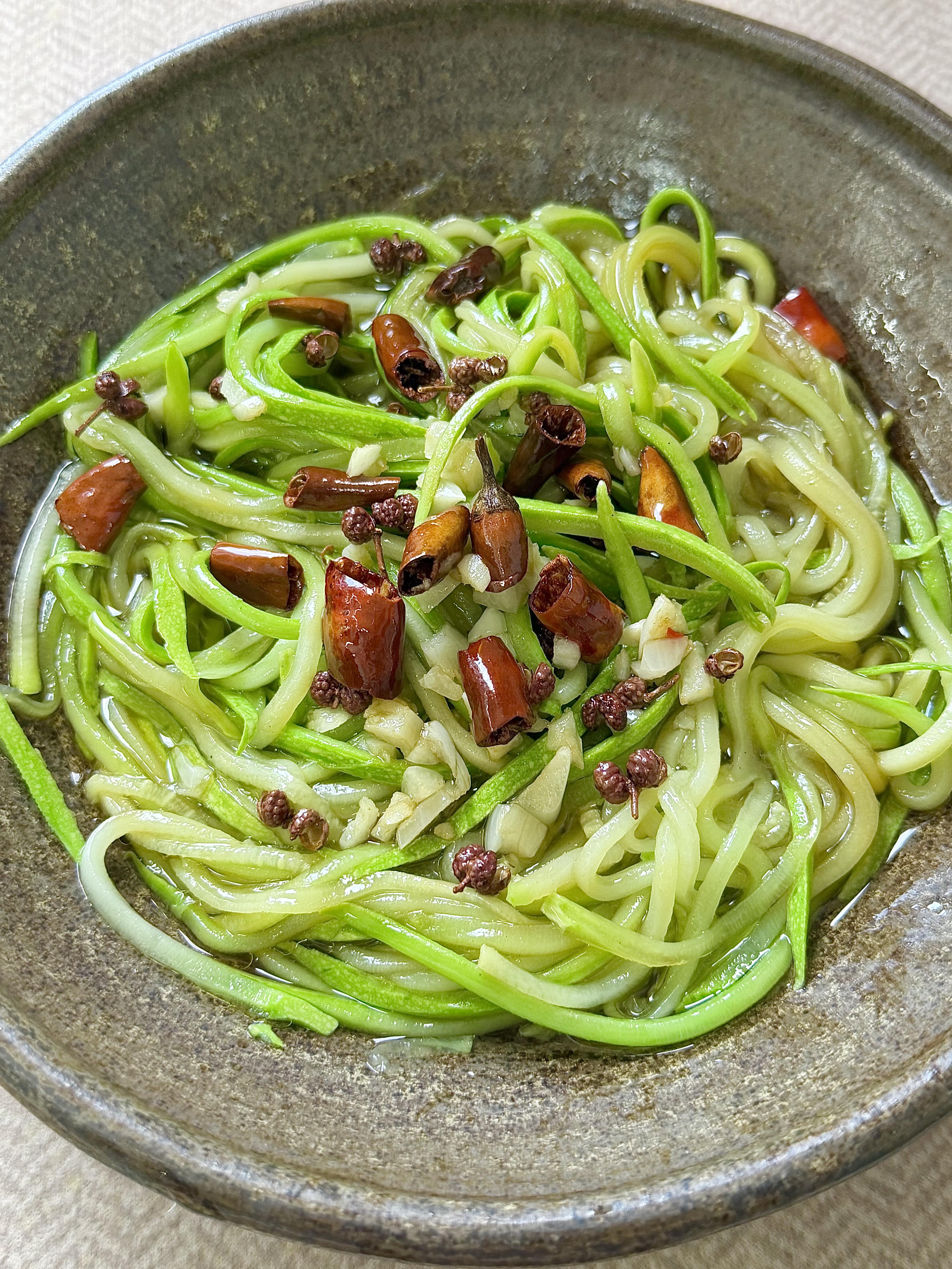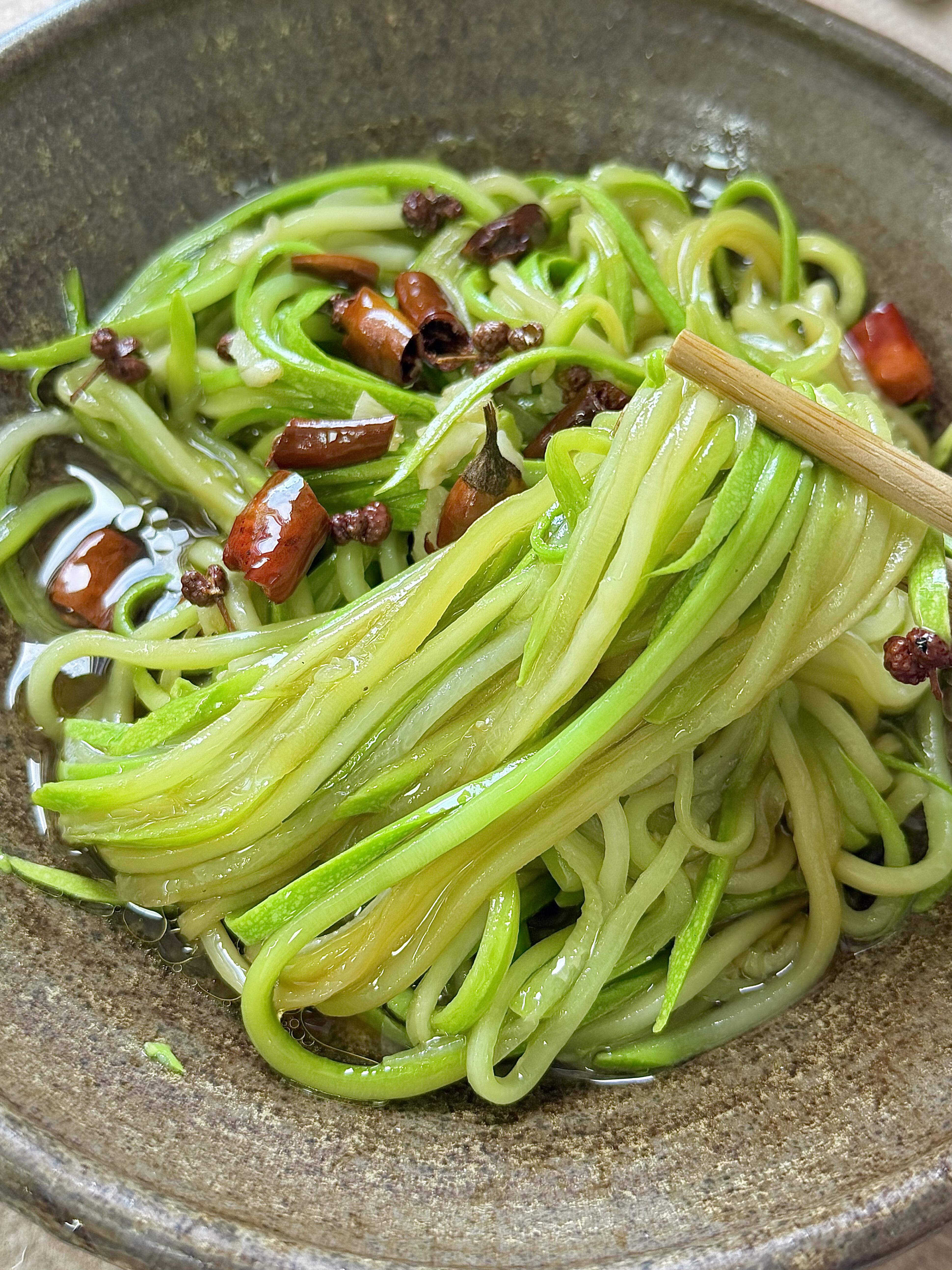 全程不用复杂操作,关键是西葫芦烫的时间别太长,过凉水才能保持脆嫩,热油炝花椒干辣椒是灵魂,香到直钻鼻子。脆嫩的西葫芦裹着鲜香的料汁,还有淡淡的麻香,解腻又开胃,家常凉菜首选这道~