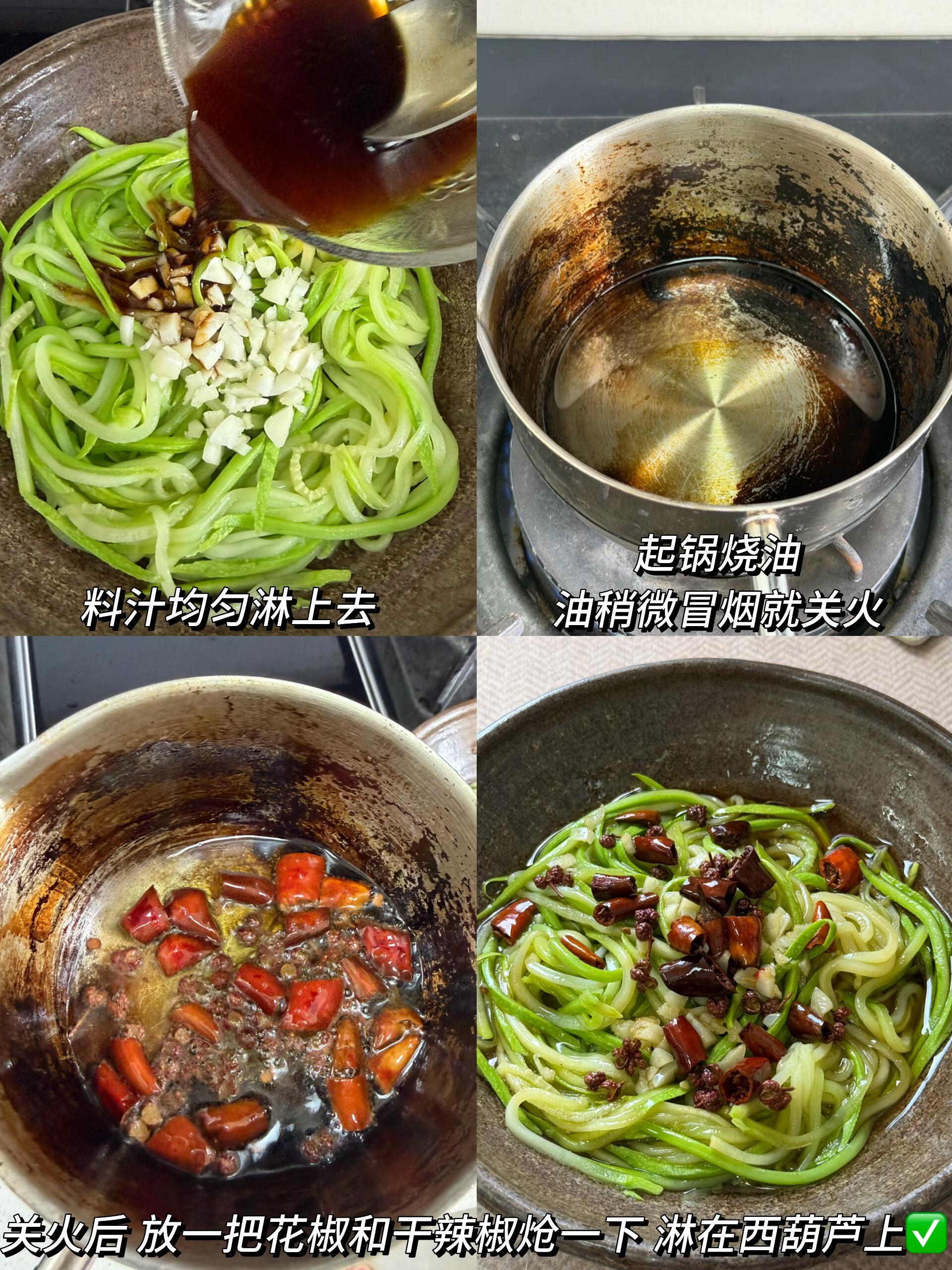 3️⃣ 把调好的料汁均匀淋在西葫芦丝上,另起锅倒入适量食用油,烧至稍微冒烟后关火,关火后放入一把花椒和干辣椒段,利用热油的余温炝出香味,然后快速淋在蒜末和西葫芦上,激发出所有香味就完成啦!
