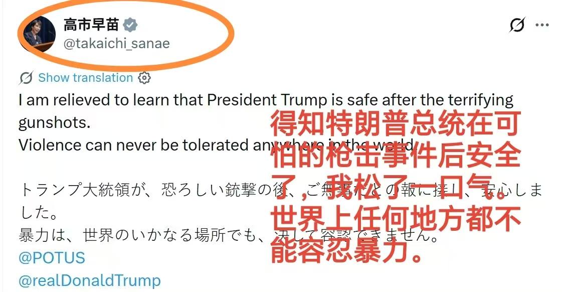 惺惺惜惺惺 得知特朗普总统在枪击案发生后安然无恙, 日本高市松了一口气,第一时