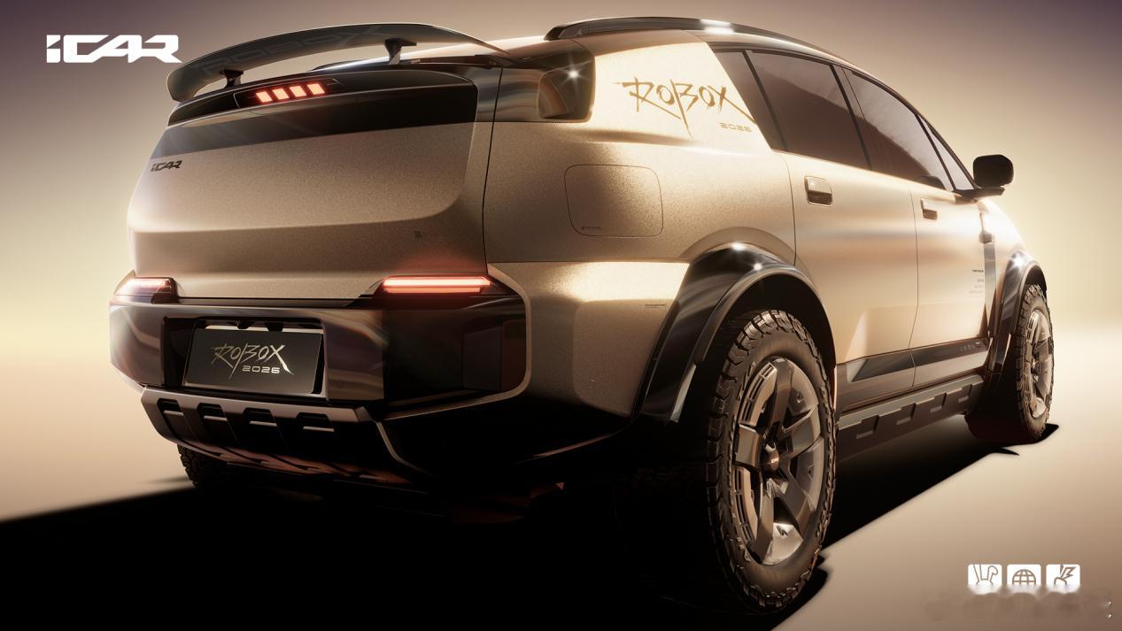 ROBOX概念车进一步演绎了iCAR“未来经典”的设计语言。车头采用圆形与矩形灯组上下分离的设计,全新灯语精致而不失经典气质。车身上半部分呈现OneBox纯粹形态,将低风阻与科技美学融于一体;腰线以下则通过超高离地间隙、超大尺寸轮毂和宽体轮眉,营造出刚柔并济的视觉冲击。整体型面简洁利落,延续了科技岛、C柱盲窗、乐高式高位刹车灯等家族元素,极具辨识度。