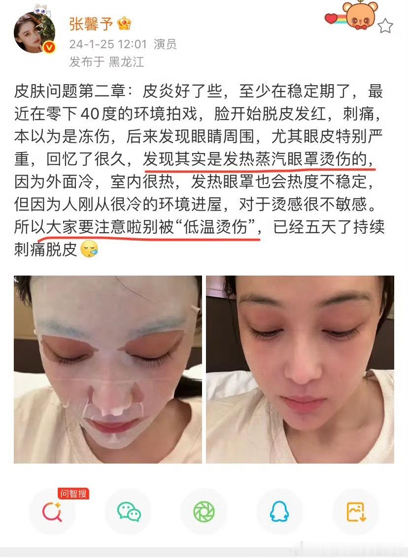 张馨予也被蒸汽眼罩烫伤过张馨予好暖心!看到杨幂发自拍脸烫伤照后第一时间评论杨幂:“我也被烫伤过,这是低温烫伤,一定小心。”张馨予在2024年1月份时也被蒸汽眼罩烫伤过,当时她的脸脱皮发红还有点刺痛,眼睛周围特别明显,还以为是冻伤的,后来才发现是被蒸汽眼罩烫伤的,她还算幸运的了,烫伤不是很明显,杨幂这个真的是好明显,不知道会不会留疤痕哦,幂姐那么爱美的人要是有疤痕了该有多难过啊!