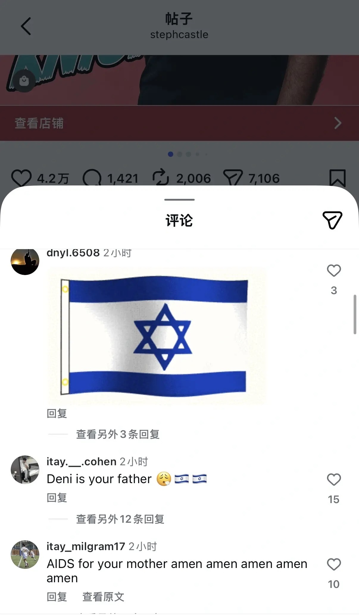 一些以色列球迷涌进了卡斯尔的INS评论区对其怒骂,包括但不限于: