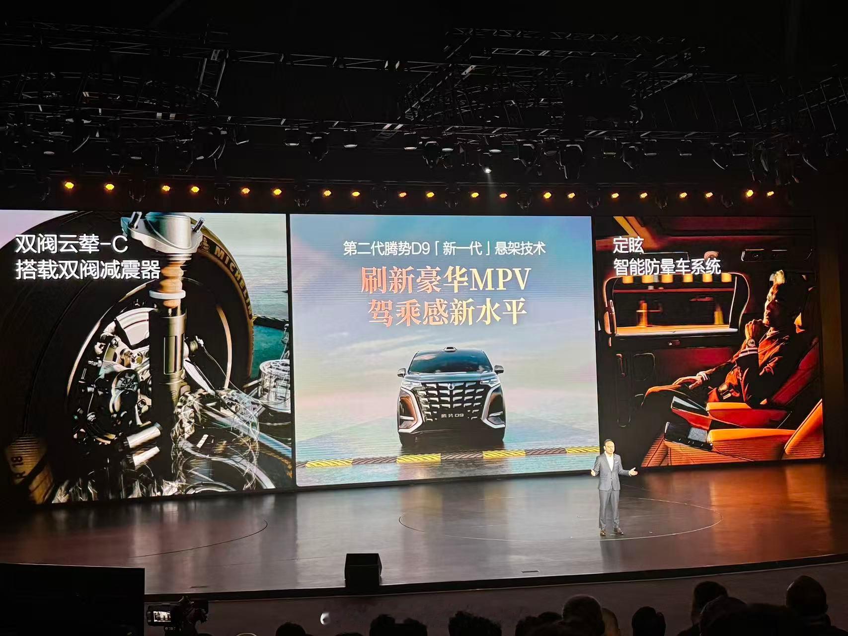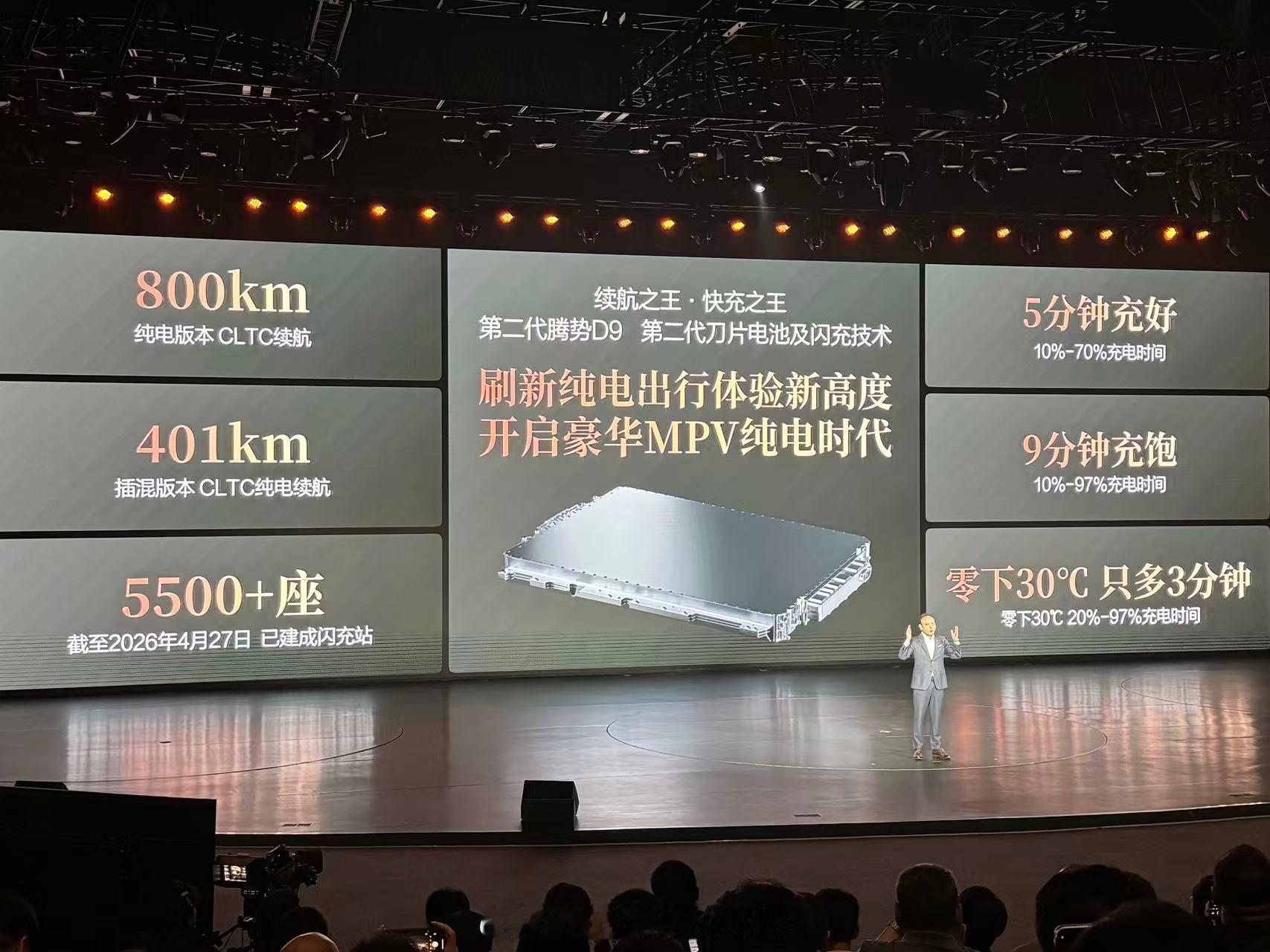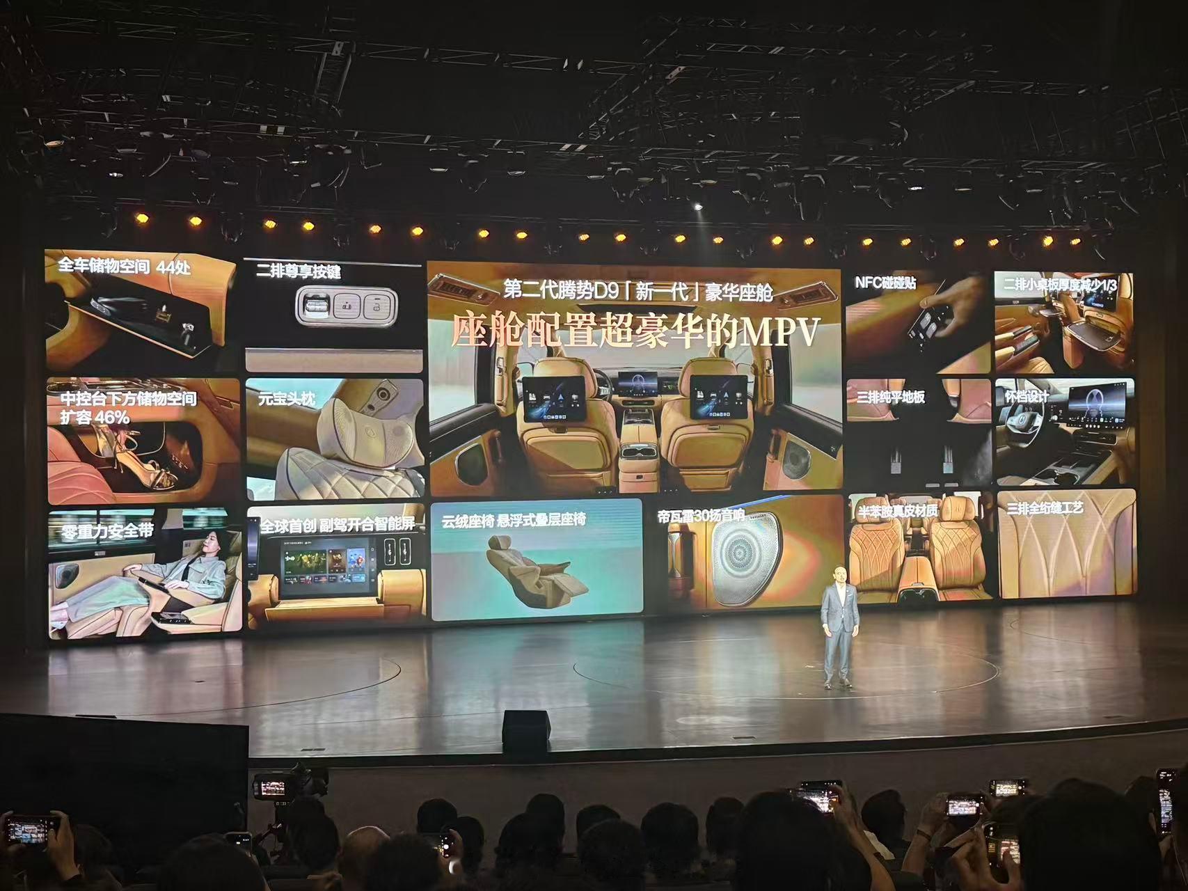 第二代腾势D9正式上市,售价35.98万—46.98万,现在下定可享至高5万元选装权益、至高2万元置换补贴等权益。这一次换代,主要升级在9个方面,包括设计、智能座舱、动力平台、辅助驾驶等。新车搭载全新的“合元”超集成动力平台,获得更大的车内空间,包括882L后备厢空间、126L下沉式储物空间。搭载第二代刀片电池及闪充技术,插混版纯电续航401公里,纯电版续航里程800公里。据悉,截止到4月27日,比亚迪已在全国建成5500座闪充站,出行无忧无虑。全系标配新一代悬架技术,配备双阀云辇-C及双阀减震器、定眩智能防晕车系统。搭载新一代AI智能座舱,拥有识人迎宾功能、模糊指令识别功能、全车11块屏幕互联、17.3英寸吸顶屏等。全系标配天神之眼5.0,搭载高感知激光雷达及4D毫米波雷达,可实现全场景绕行和全场景掉头。腾势D9把老车主宠上天了第二代腾势D9搭载闪充今晚上市第二代腾势D9