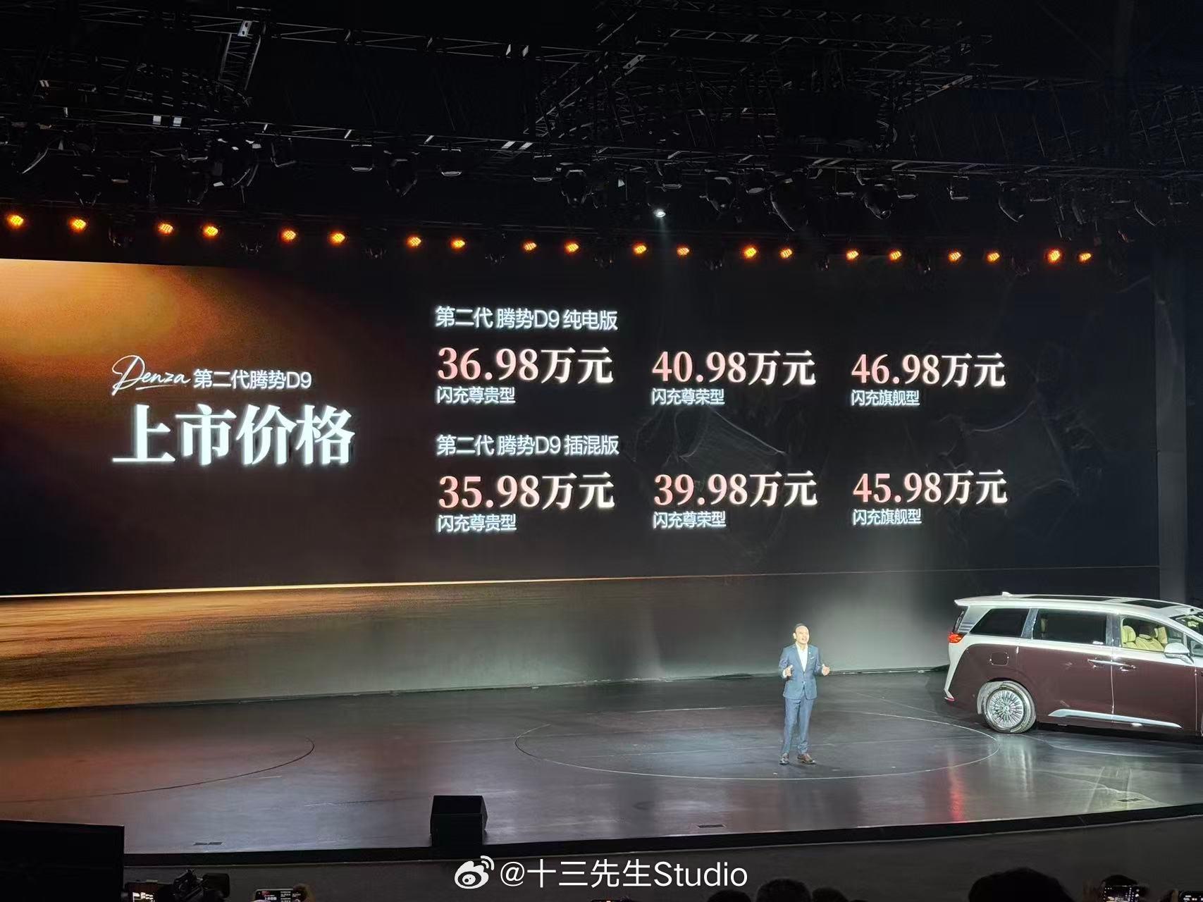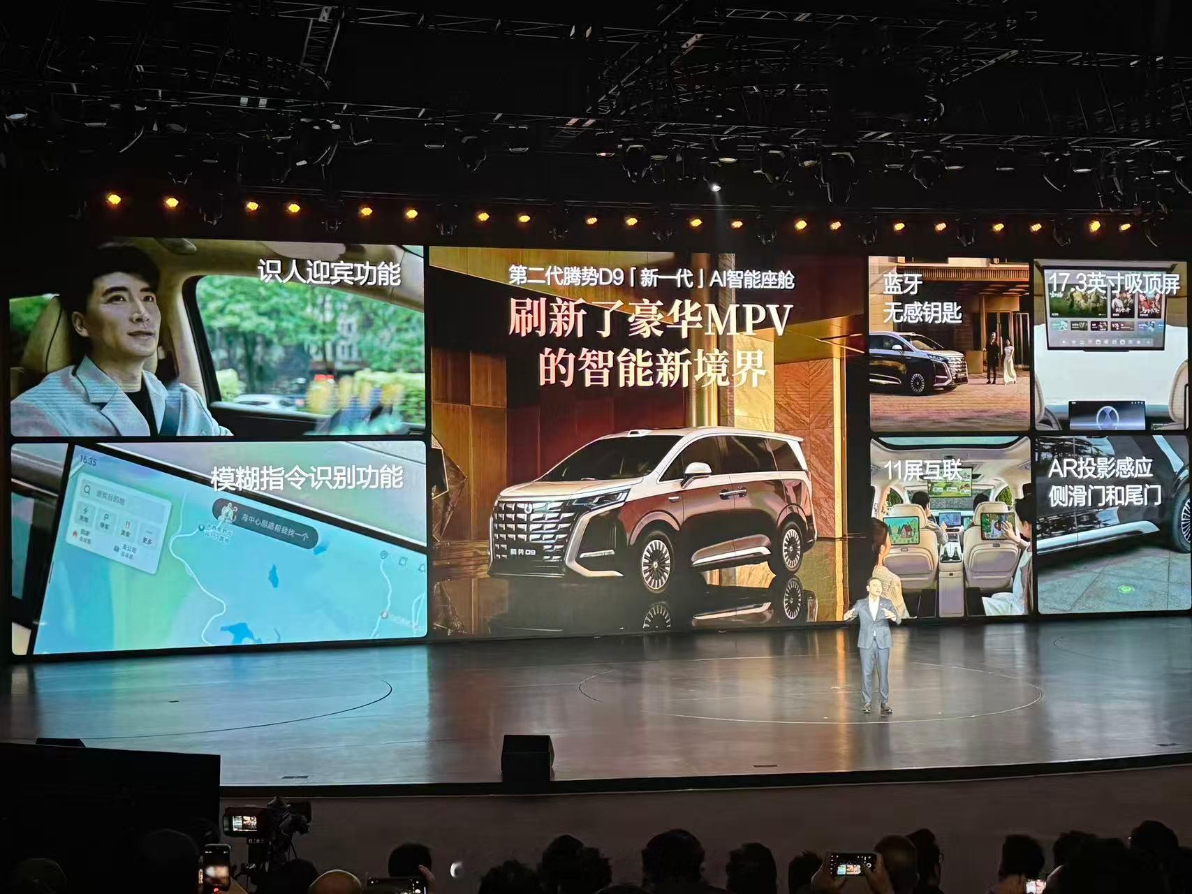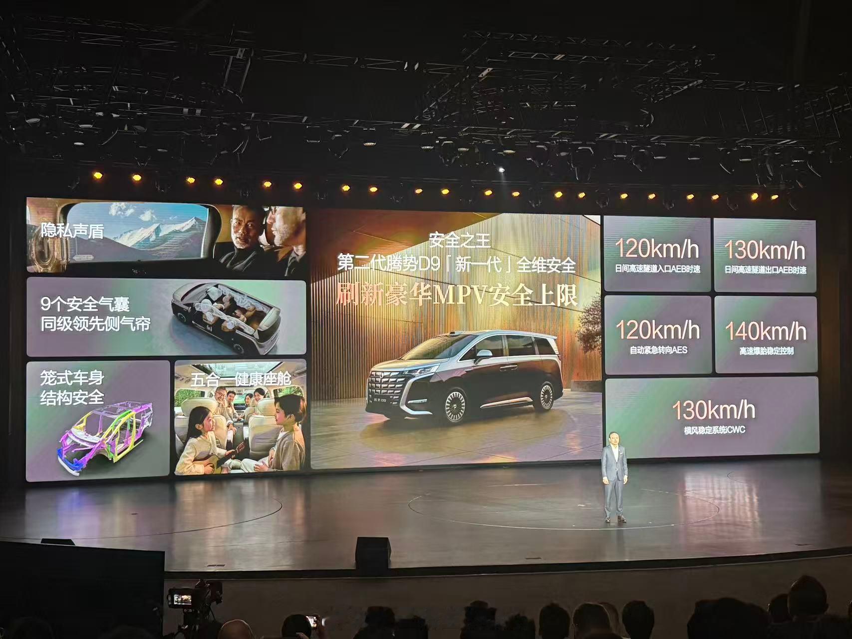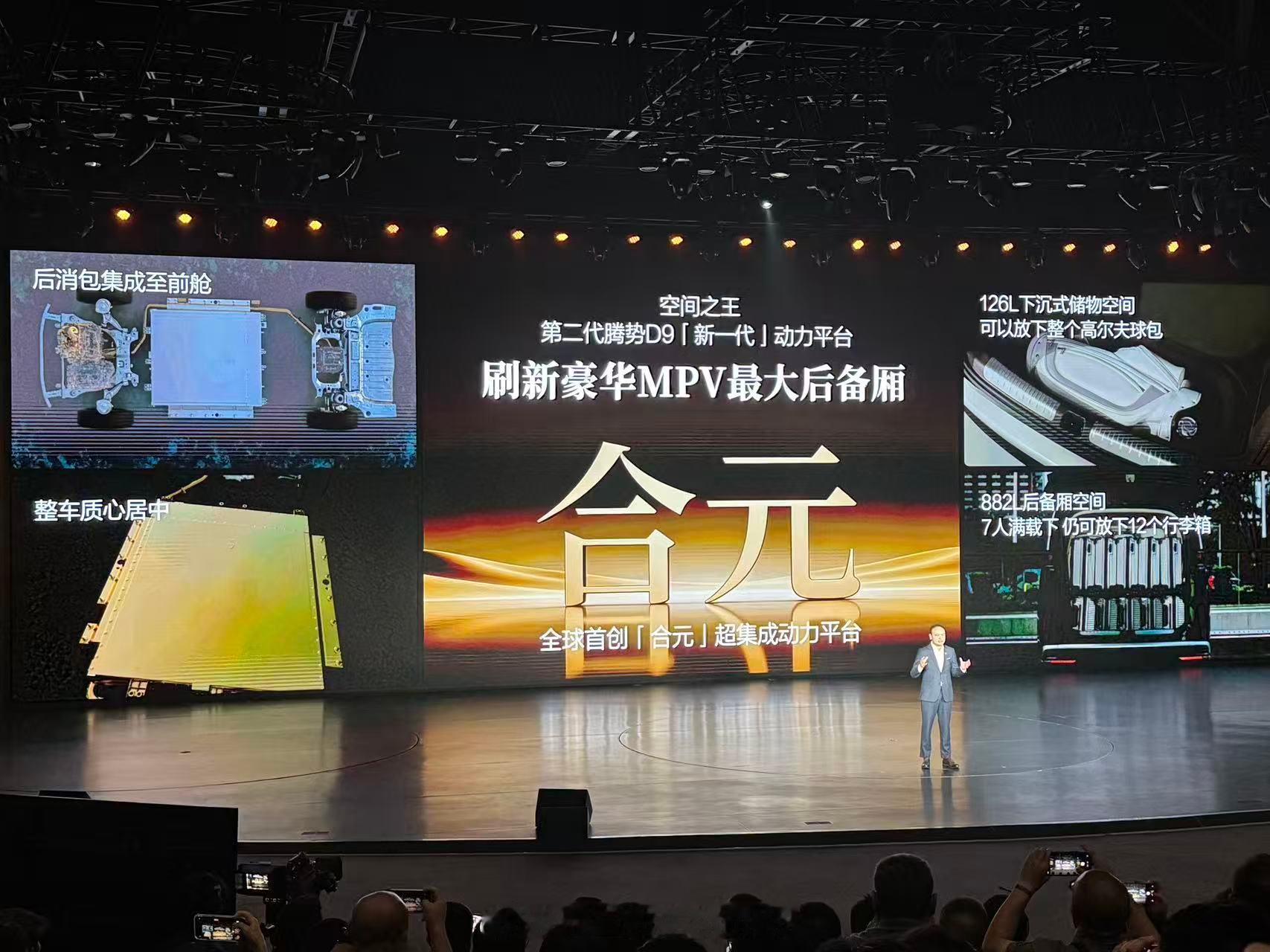 第二代腾势D9正式上市,售价35.98万—46.98万,现在下定可享至高5万元选装权益、至高2万元置换补贴等权益。这一次换代,主要升级在9个方面,包括设计、智能座舱、动力平台、辅助驾驶等。新车搭载全新的“合元”超集成动力平台,获得更大的车内空间,包括882L后备厢空间、126L下沉式储物空间。搭载第二代刀片电池及闪充技术,插混版纯电续航401公里,纯电版续航里程800公里。据悉,截止到4月27日,比亚迪已在全国建成5500座闪充站,出行无忧无虑。全系标配新一代悬架技术,配备双阀云辇-C及双阀减震器、定眩智能防晕车系统。搭载新一代AI智能座舱,拥有识人迎宾功能、模糊指令识别功能、全车11块屏幕互联、17.3英寸吸顶屏等。全系标配天神之眼5.0,搭载高感知激光雷达及4D毫米波雷达,可实现全场景绕行和全场景掉头。腾势D9把老车主宠上天了第二代腾势D9搭载闪充今晚上市第二代腾势D9