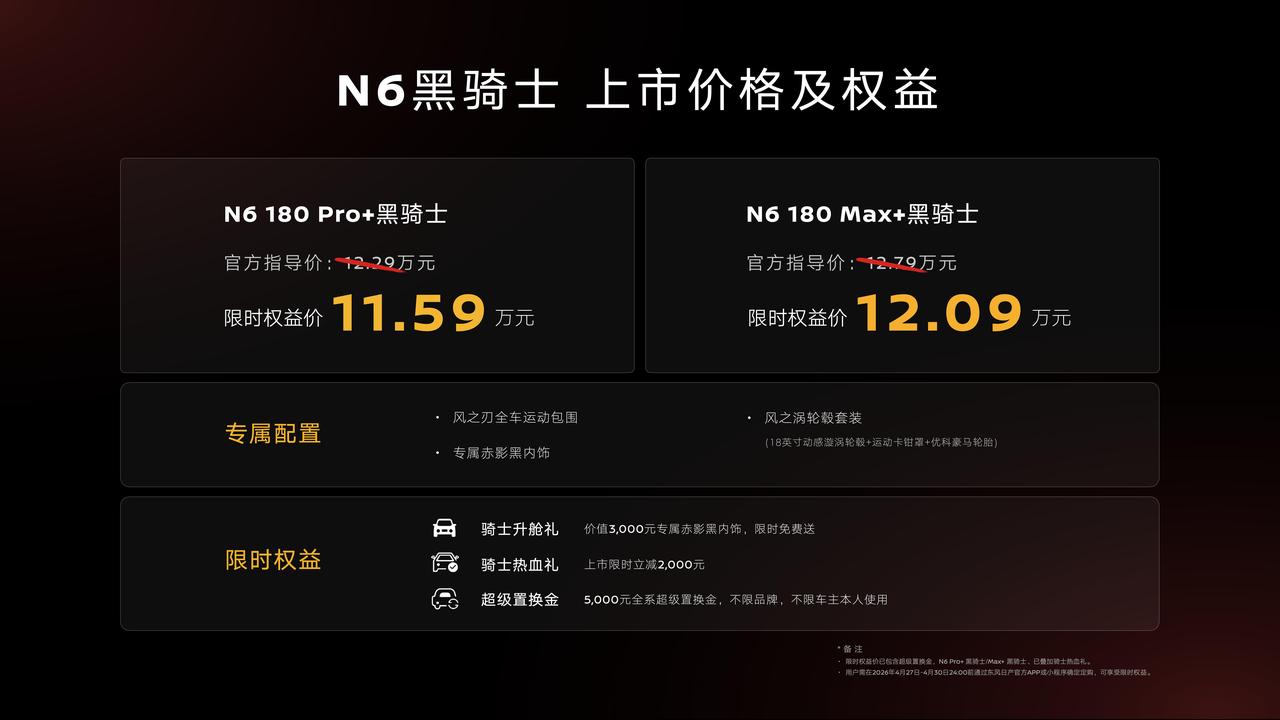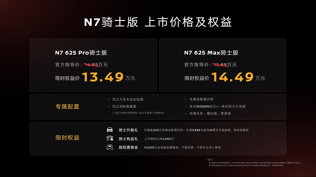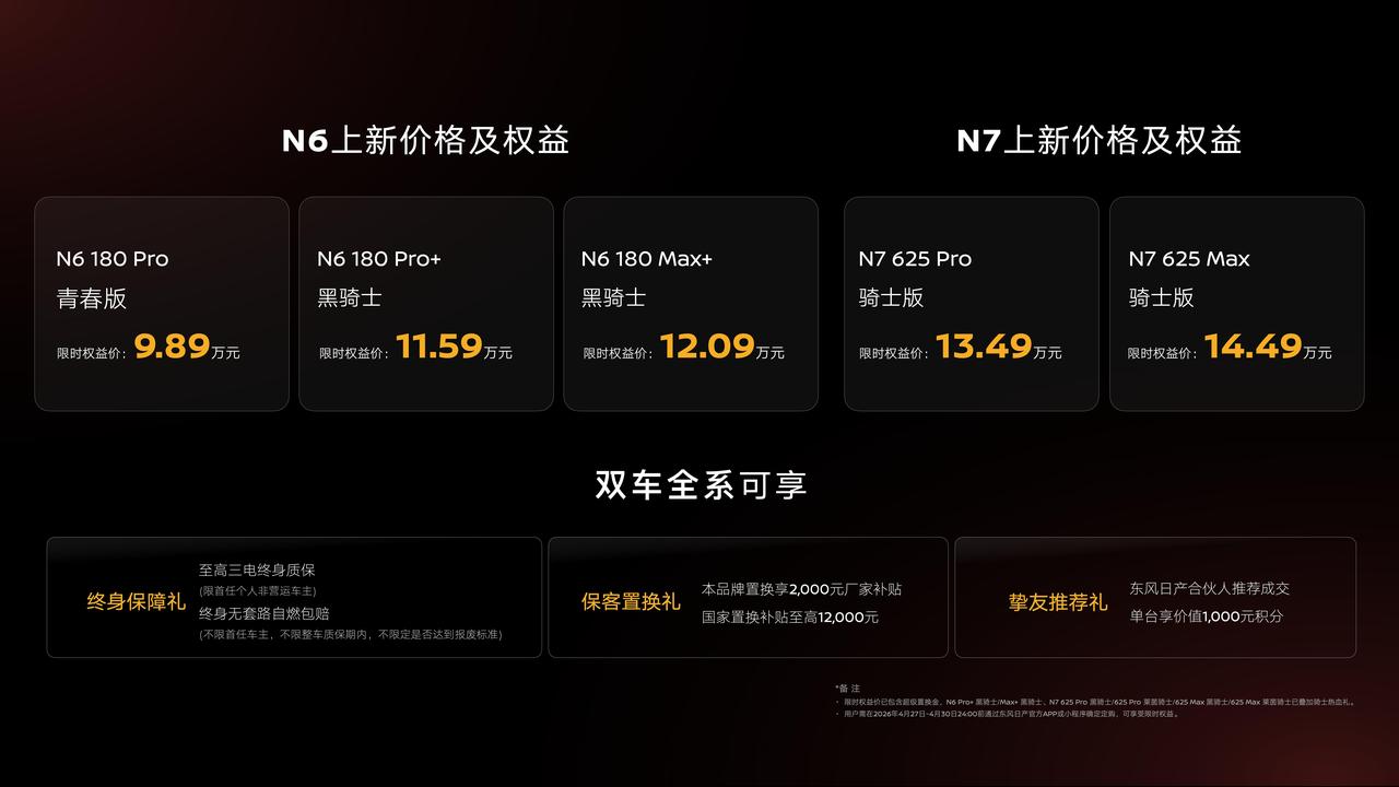 东风日产4月27日一口气上了三款车:N6 Pro青春版9.89万,N6骑士版11.59万起,N7骑士版13.49万起。全系送三电终身质保加终身自燃包赔。