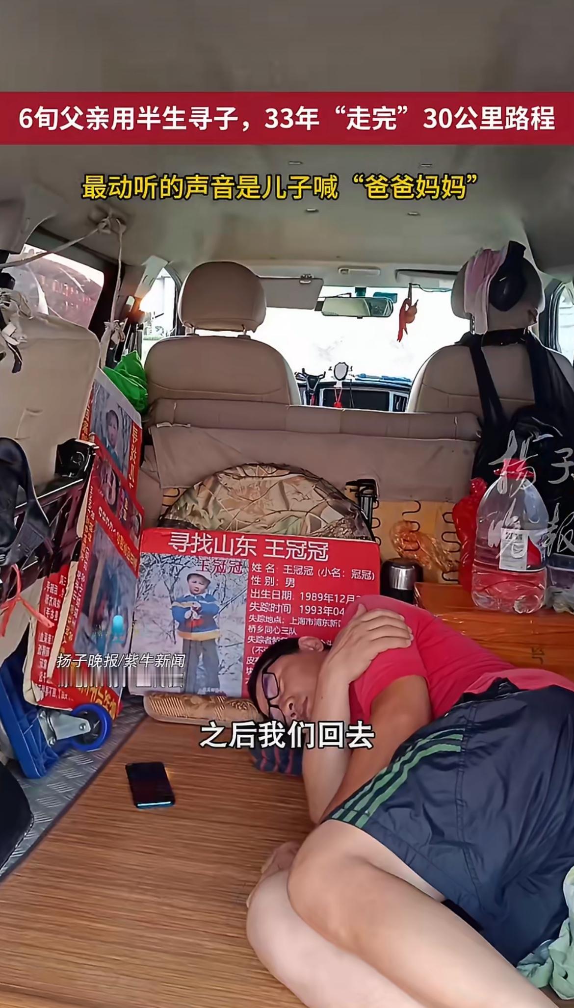 最开始他骑三轮车,轮胎磨坏了好几个,后来换了二手农用车,近些年又买了面包车,这台车既是他移动的家,也是寻子的“战车”,车身贴满了儿子和其他走失儿童的信息,车厢里的铁板就是床,饿了就啃馒头、吃大葱卷煎饼,一边打零工挣钱,一边找孩子。