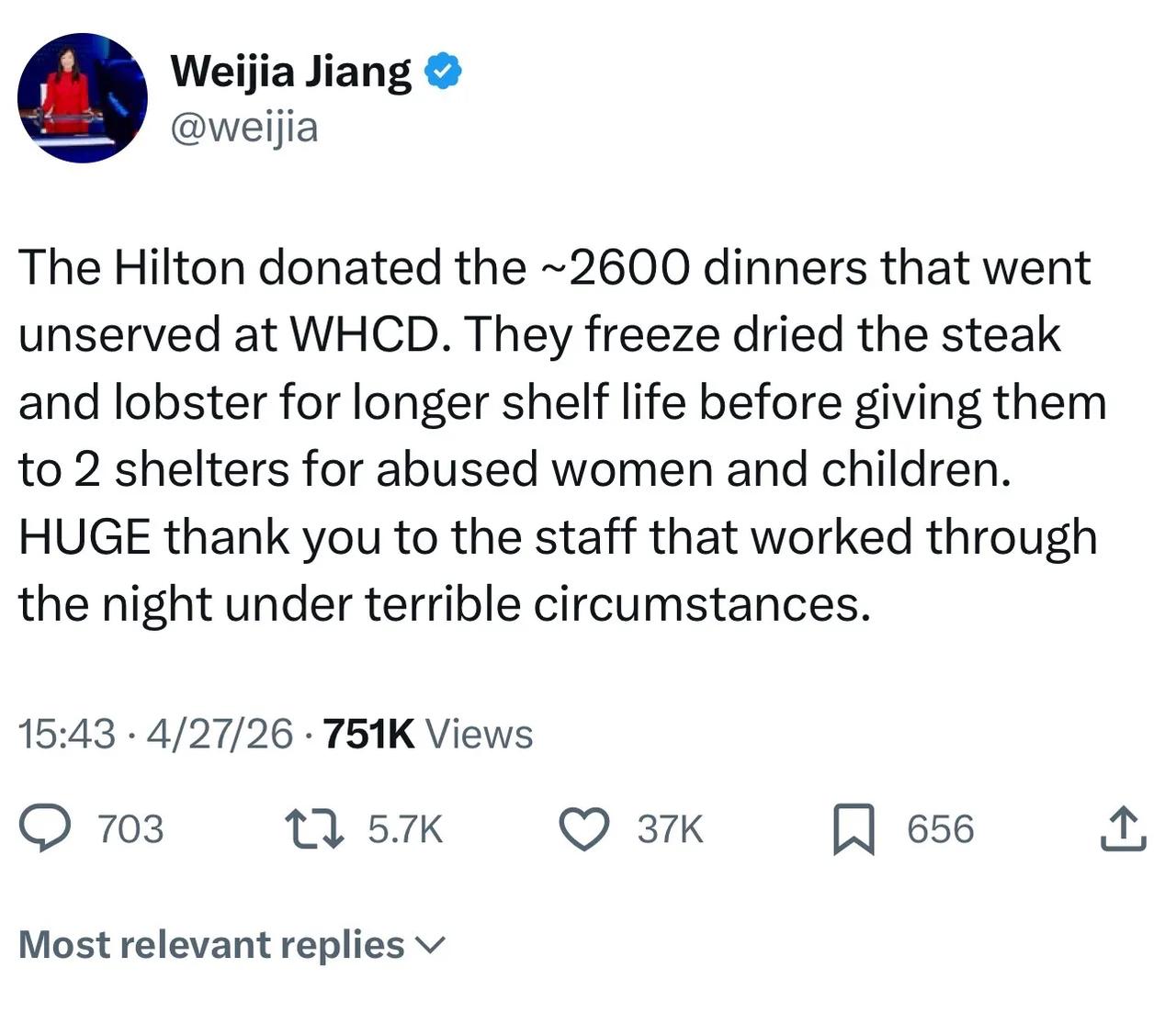 500刀一人的白宫记者晚宴,只上了一盘沙拉就戛然而止… 所以剩下的菜怎么办?白宫记者协会主席宣布,主办晚宴的希尔顿酒店将大约2600份未被享用的晚餐全部捐出。他们把牛排和龙虾进行冷冻处理,以延长保存时间,然后把这些食物捐赠给两家为受虐妇女和儿童提供庇护的收容所。