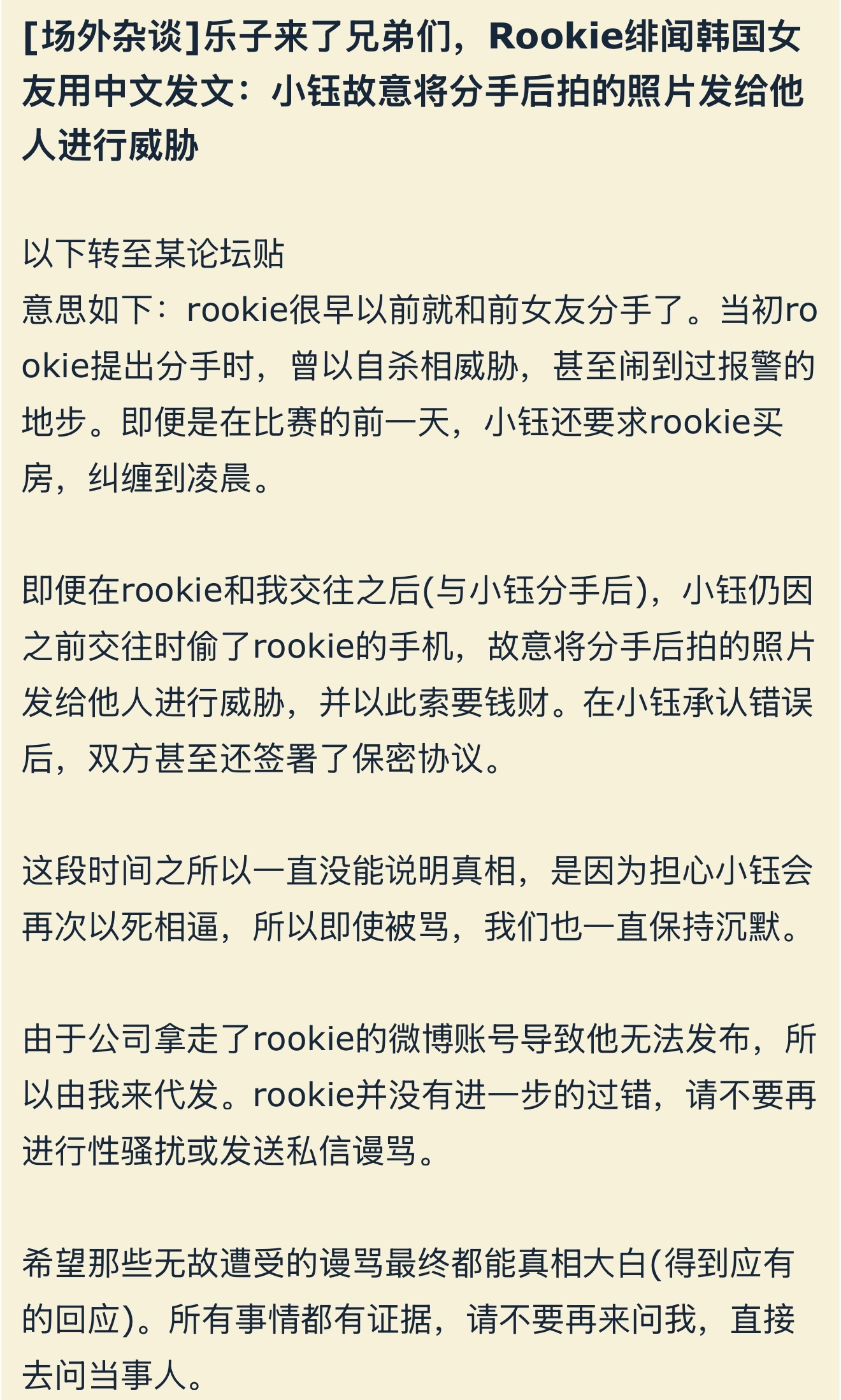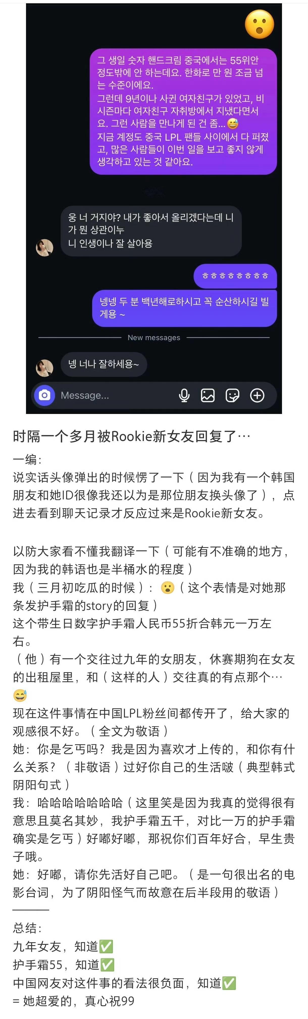 Rookie女友发文回应否认出轨。英雄联盟