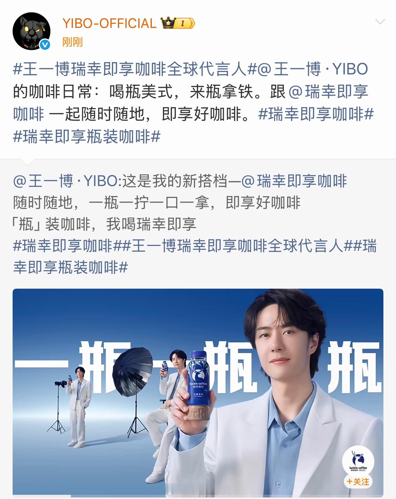 恭喜王一博瑞幸即享咖啡全球代言人正式官宣,无缝衔接的商务好丝滑啊。