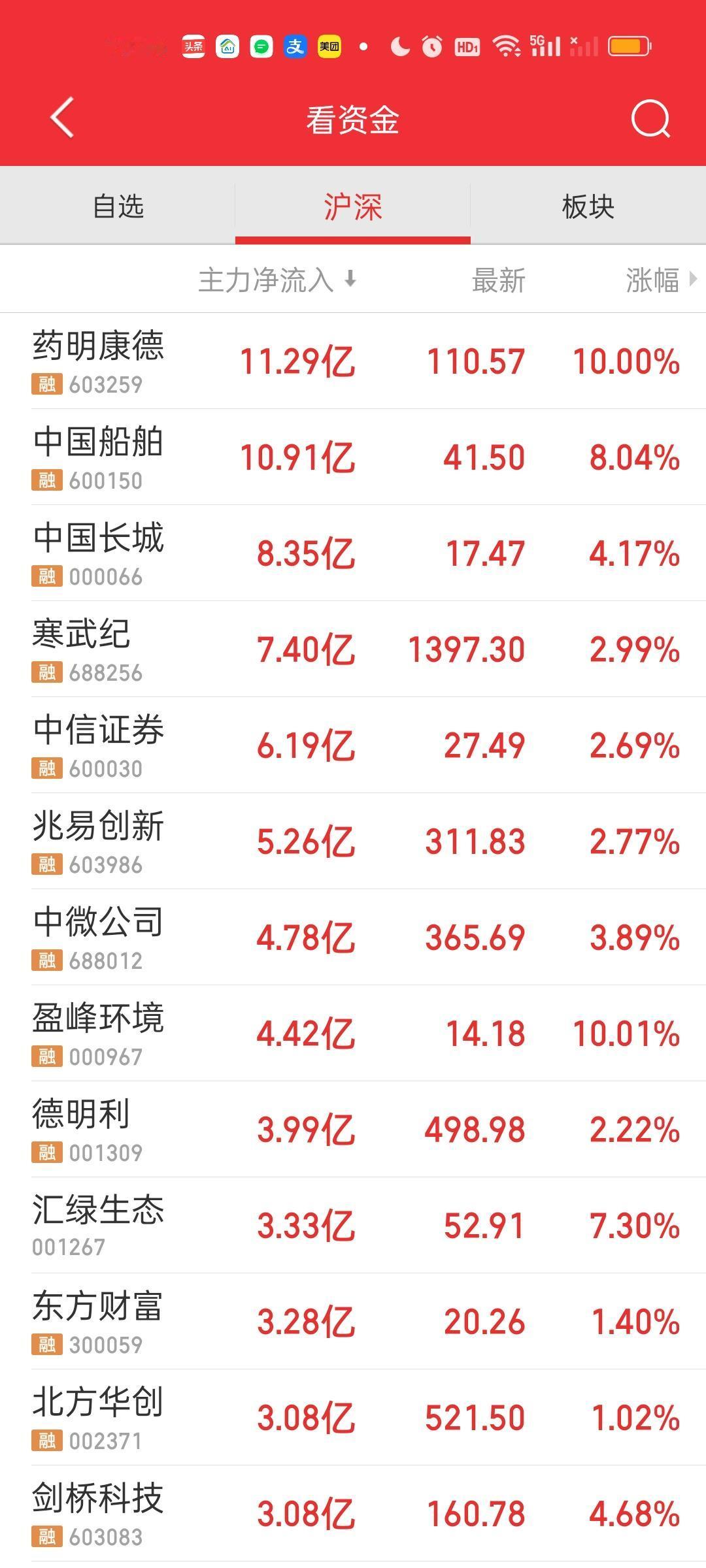 主力资金净流入超10亿的个股有药明康德,中国船舶,主力资金净流出超10亿的个股有中际旭创,天孚通信,立讯精密。