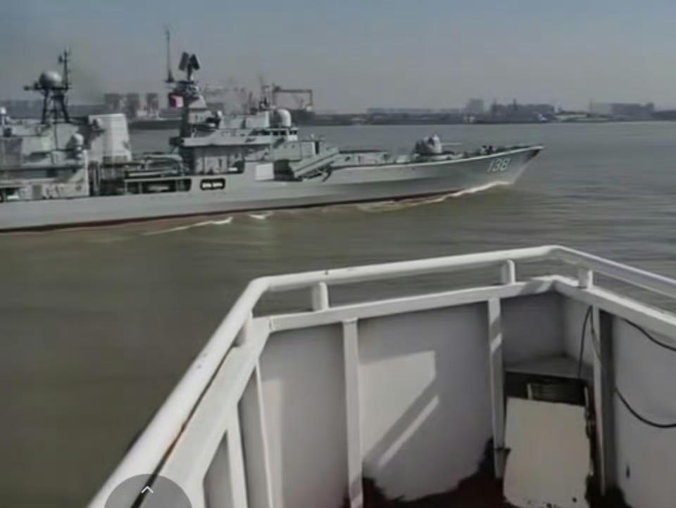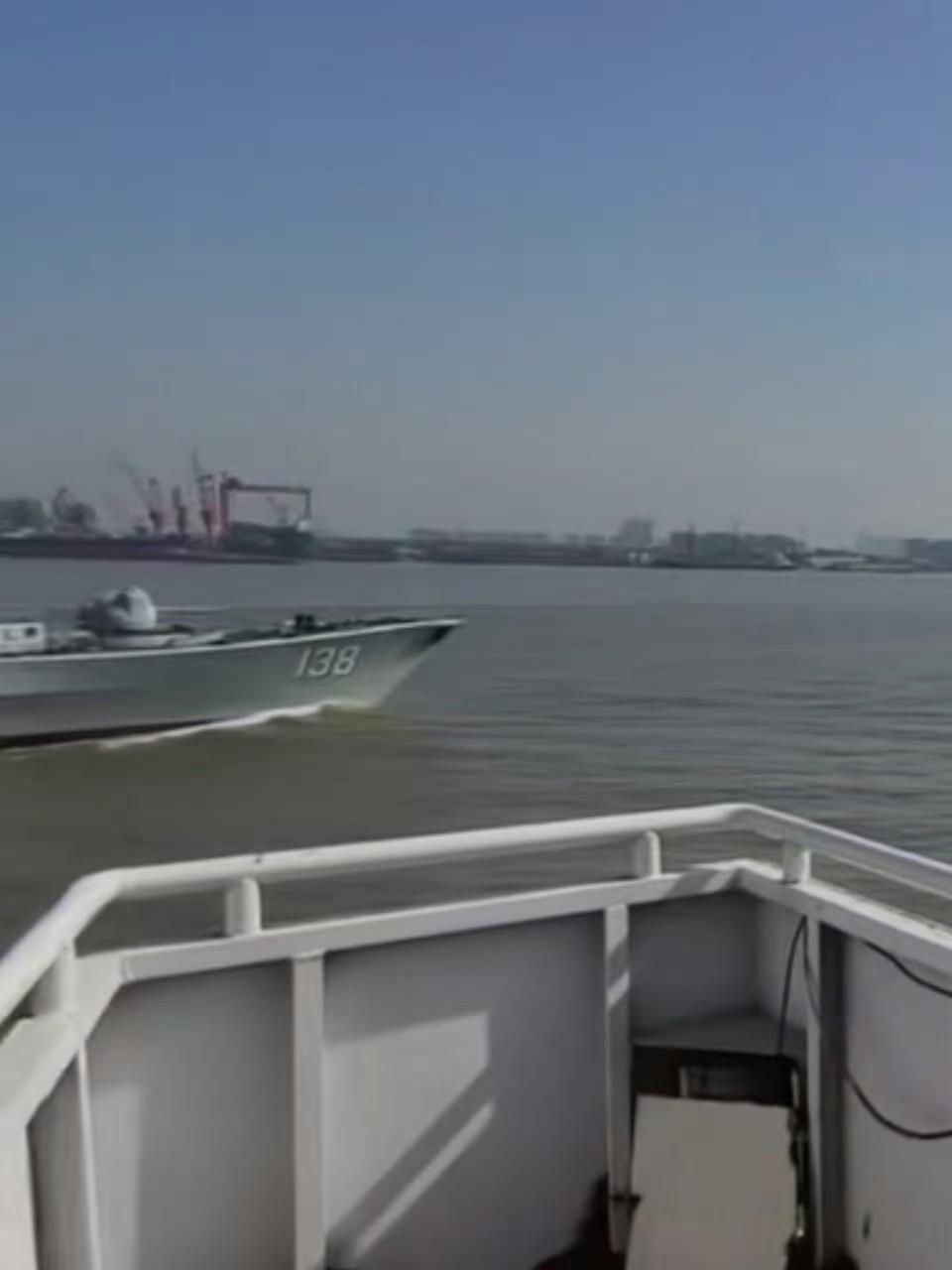 长江航道散装货运船偶遇满载8000吨级泰州号驱逐舰舰