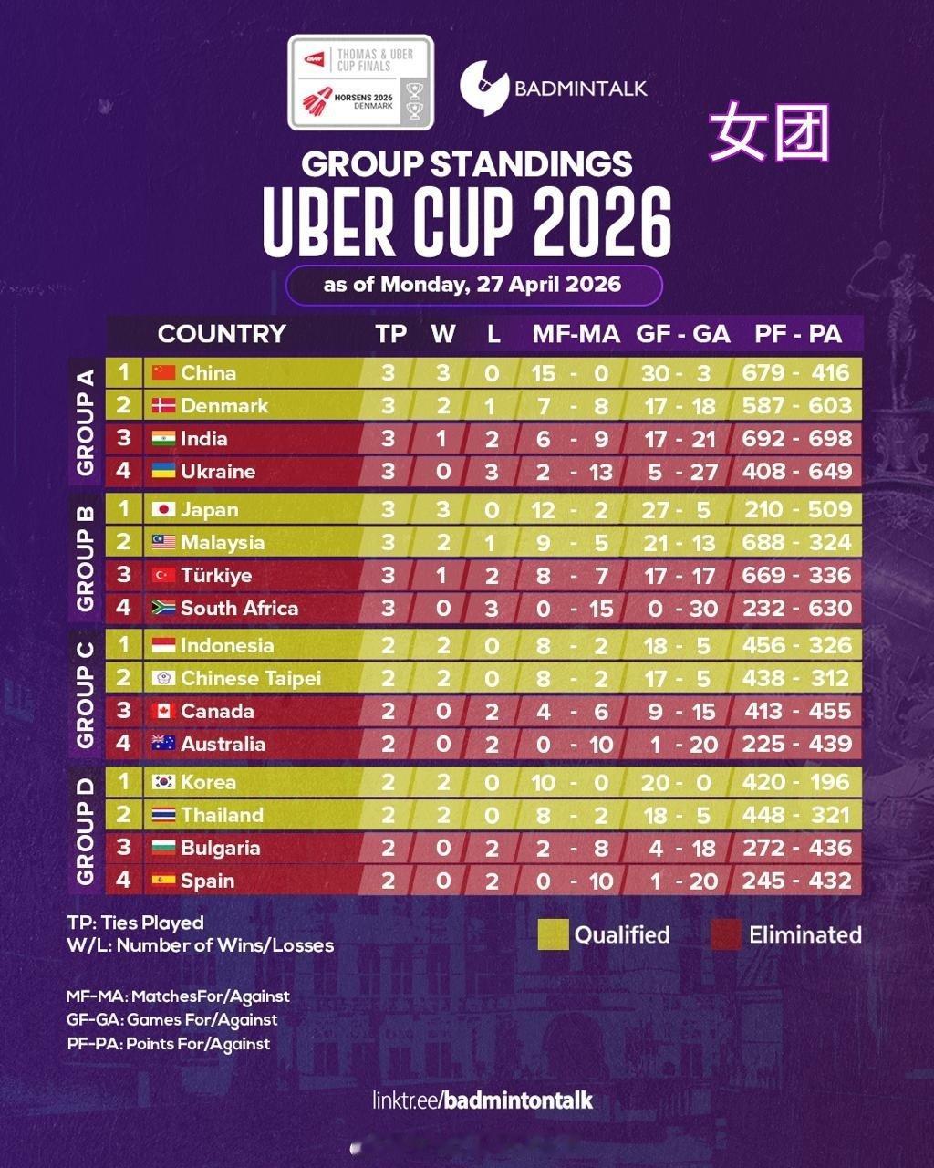👧🏻女团;各组前2名全部提前出线中国🇨🇳和日本🇯🇵小组第一出线印尼和台北、韩国和泰国将争夺小组第一