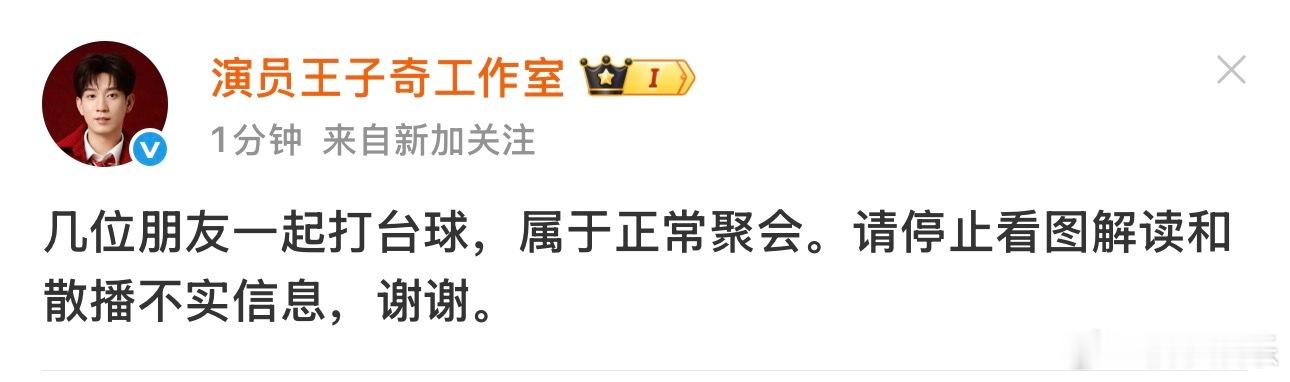 王子奇方否认恋情 王子奇方否认恋情,回应称几位朋友一起打台球,属于正常聚会。请停