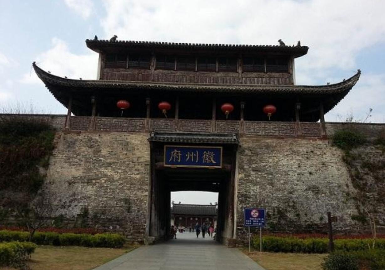 ②徽州府衙 :明代规制重建,一轴五门,有仿古升堂表演,登谯楼俯瞰全城马头墙。