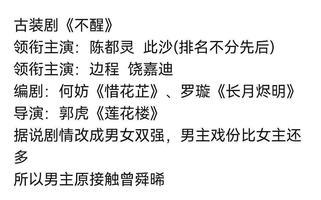 陈都灵古偶新剧《不醒》和此沙平番,这部戏之前还找过曾舜晞,曾舜晞和陈都灵的CP感还不如鞠婧祎和田嘉瑞…